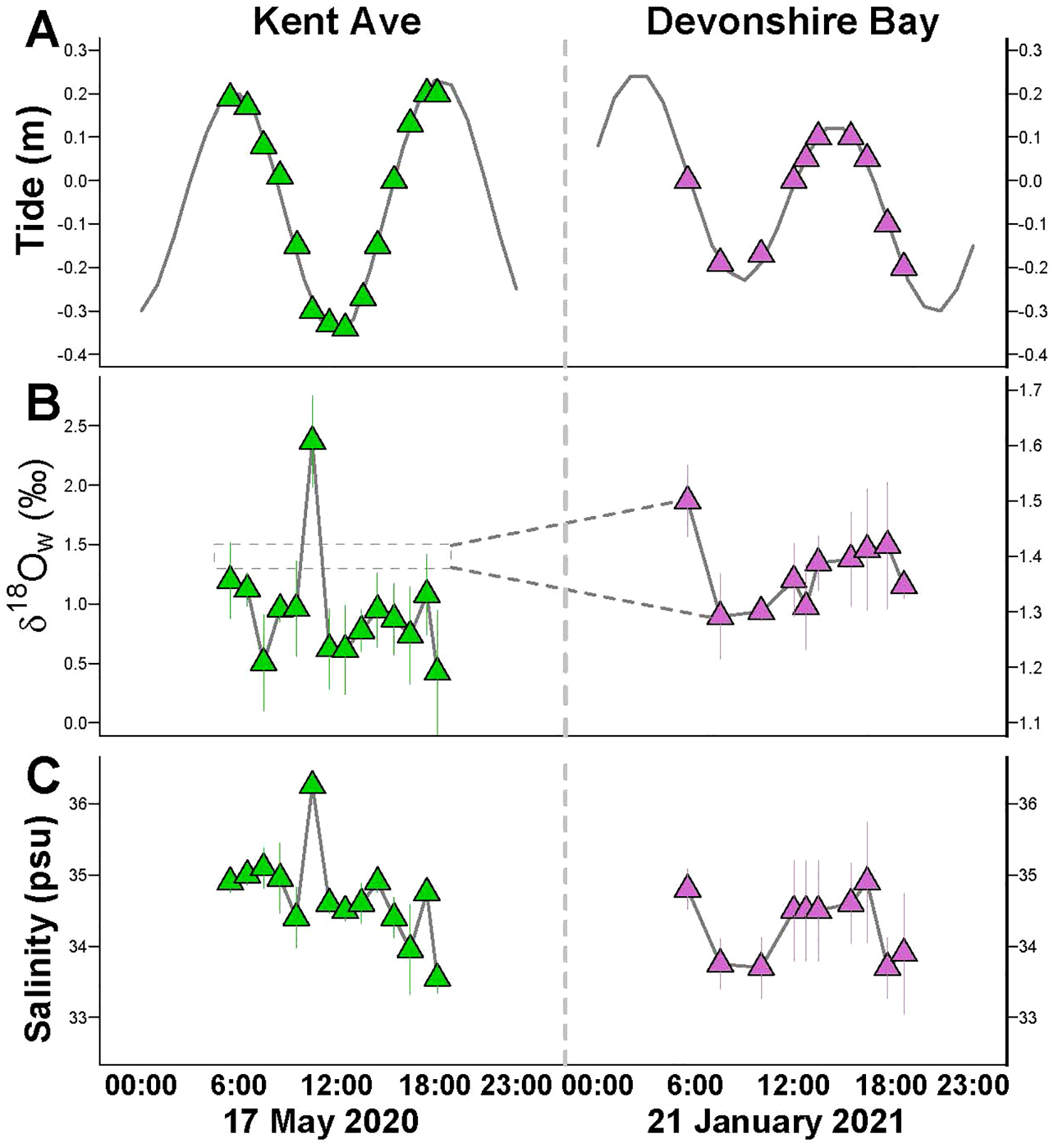 (A) Daily tidal information, with points indicate sampling time. (B) δ18Ow data of hourly sampling at Kent Ave and Devonshire Bay. (C) Salinity data of hourly sampling at Kent Ave and Devonshire Bay. Errors reflect reproducibility of the measurements, reported as 1SD of the mean.