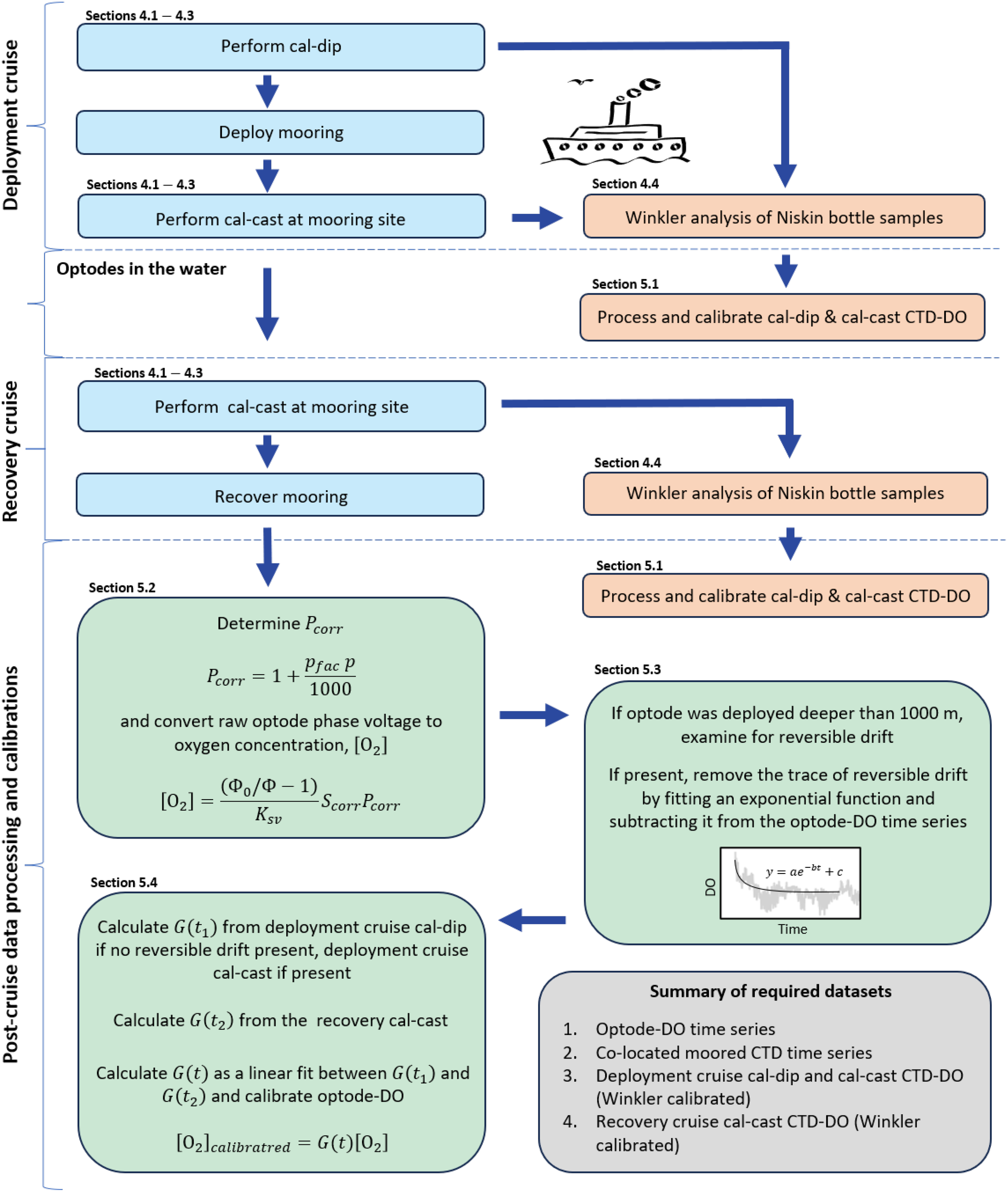 In short, the major aspects of optode deployment and calibration, summarized in Figure 1, are: a) the deployment and recovery of the moored optodes, along with the collection of necessary CTD-DO profiles (blue boxes), b) the calibration of CTD-DO profiles using Winkler-analyzed bottle samples (orange boxes), and c) the post-cruise processing and calibration of optode data, which includes conversion of raw optode outputs to DO concentrations and the correction of drift using Winkler-calibrated CTD-DO profiles (green boxes).