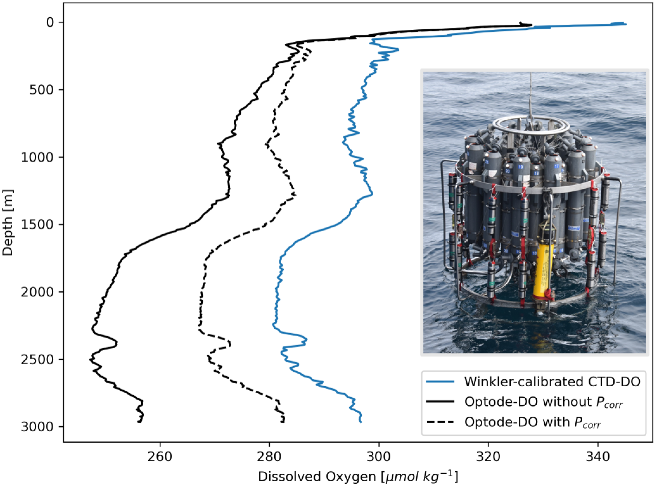 An example cal-dip profile illustrating the instantaneous pressure response seen in uncorrected optode-DO (solid black line) relative to Winkler-calibrated CTD-DO (blue line). Application of in Equation 1 removes only the instantaneous pressure response, with the dotted black line showing the result of its removal. The inset photo shows an example of a cal-dip, where the optodes are strapped to the frame of the CTD profiler.