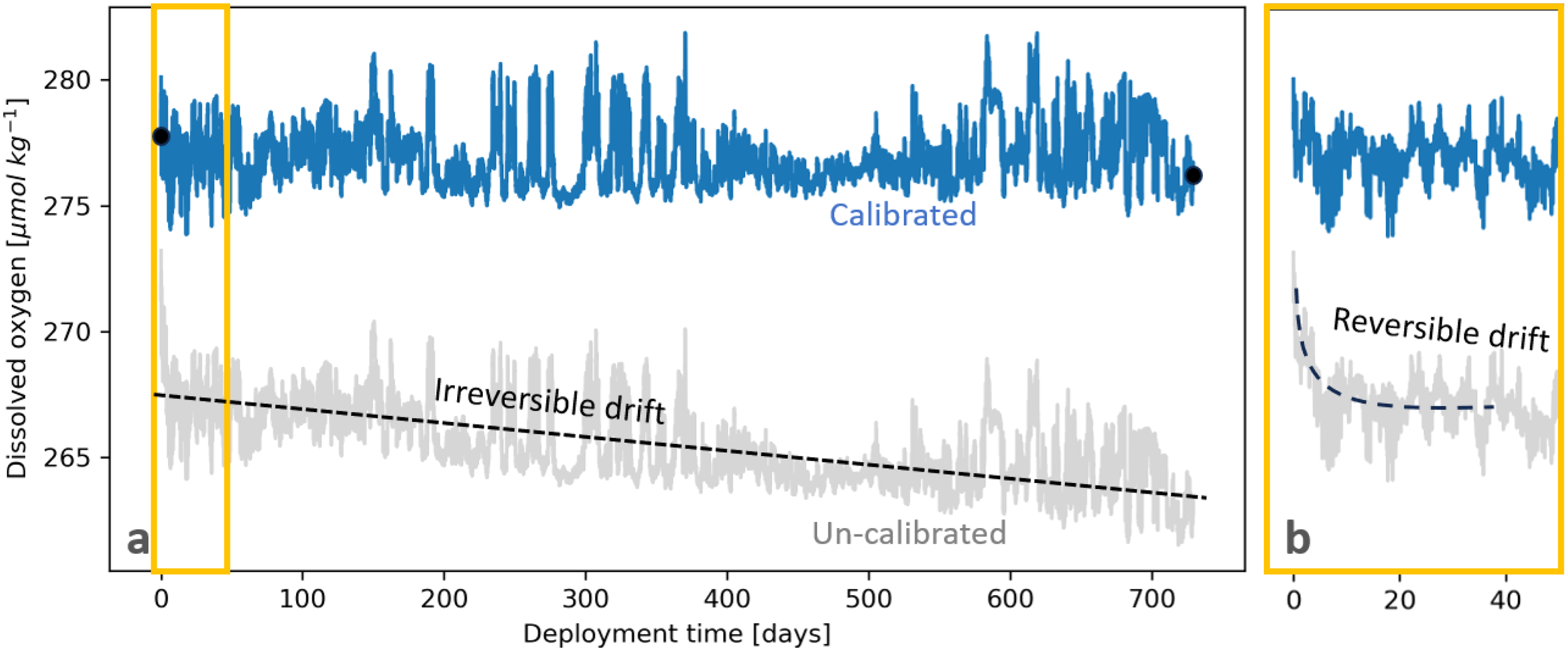 Observations of reversible drift are limited compared to those of irreversible drift, but our own observations and those reported in Berx et al., 2019 allow us to define a working definition of reversible drift as an exponential decay at the start of an optode-DO time series from deeper than 1,000 m that occurs in the absence of a similar decay in the co-located potential temperature time series. We recommend that the reversible drift be removed only when there is no corresponding change in potential temperature, in order to avoid the inadvertent removal of real DO changes associated with changes in temperature-dependent solubility or movement of different water masses past the mooring site. The user may wish to also consider the salinity time series in regions where salinity provides additional information on dynamic processes. The exponential decrease in DO associated with reversible drift can appear on multiple time scales, loosely categorized as “fast drift” (time scales on the order of days) and “slow drift” (time scales on the order of weeks to months) (Berx et al., 2019). A single optode can exhibit reversible drift on both time scales. The observed reversible drift is most pronounced in the optodes deployed below 1,000 m; above 1,000 m, the reversible drift—if present—is indistinguishable from the sensor noise and natural variability.