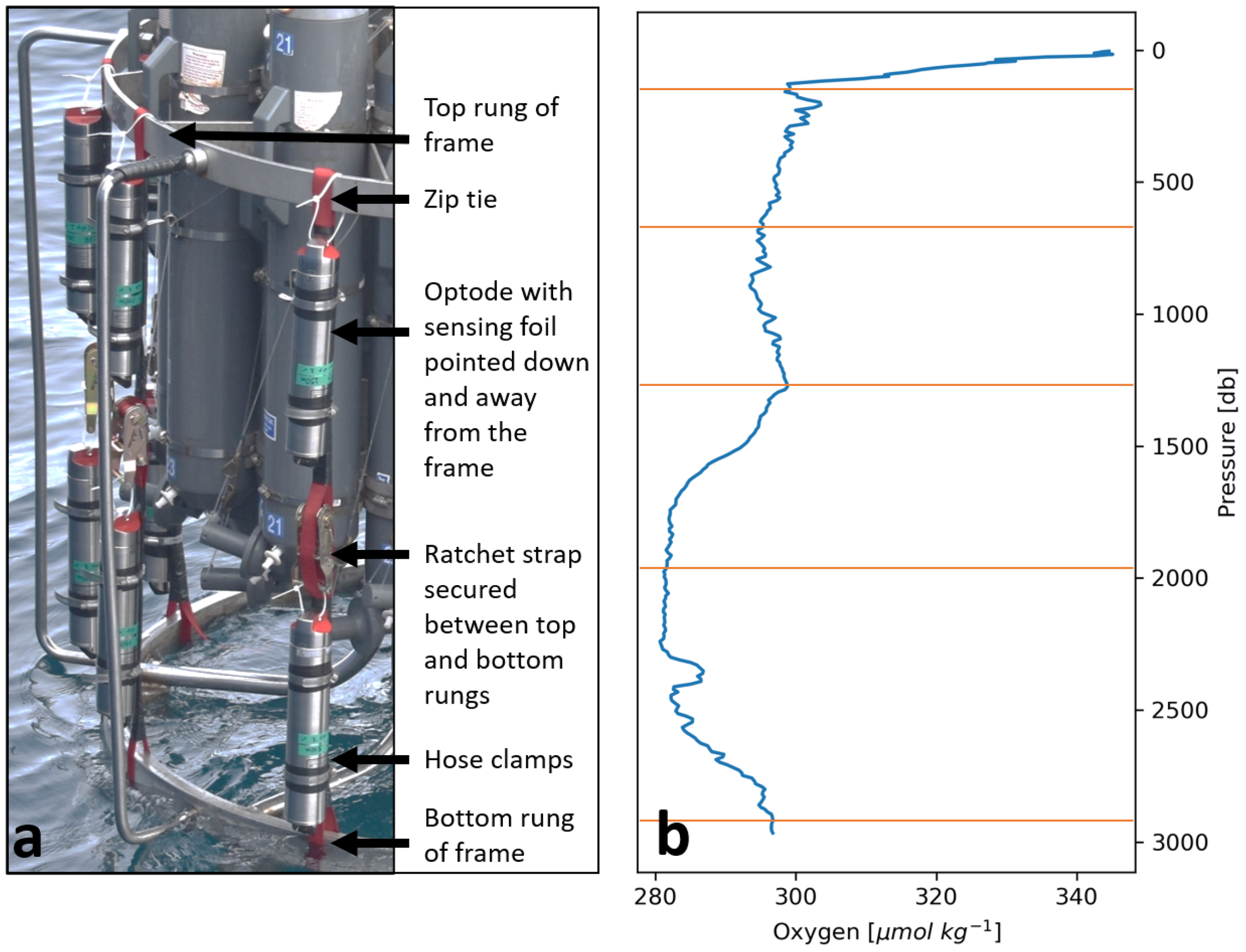 Every optode must be deployed on a cal-dip cast prior to its deployment on the mooring. Multiple optodes can be “cal-dipped” on a single cal-dip cast, limited only by how many optodes can be reasonably attached to the frame of the CTD profiler. To set up a cal-dip, optodes should be securely attached to the frame of the shipboard CTD profiler with their sensing foils facing downward and away from the frame; this avoids particles settling on the foils. One method for attaching optodes to the frame is to secure ratchet straps between the top and bottom rungs of the frame and affix the optodes to the straps using hose clamps and zip ties, as in Figure 5. The cal-dip cast does not need to be close to the mooring site and can be performed anywhere in the region with a similar water mass structure, provided that it is done a) within days of the mooring deployment and b) to depths greater than 1,000 m and to at least the same depth as the planned mooring deployment. The first requirement aims to minimize the amount of irreversible drift that can occur between the cal-dip and optode deployment, therefore preserving the accuracy of derived from the cal-dip. We found that derived from cal-dips performed within 10 days prior to mooring deployment generally agreed with derived from cal-casts collected on the same mooring deployment cruise to within 1%. The second requirement ensures adequate characterization of in Equation 1. It also allows for greater confidence in derived from the ratio of the CTD-DO and optode-DO profiles by capturing more stable, deep water masses; a portion of the profile in the upper ocean is typically excluded from this calculation due to high variability and the differing response times of the CTD profiler electrode and the optode.