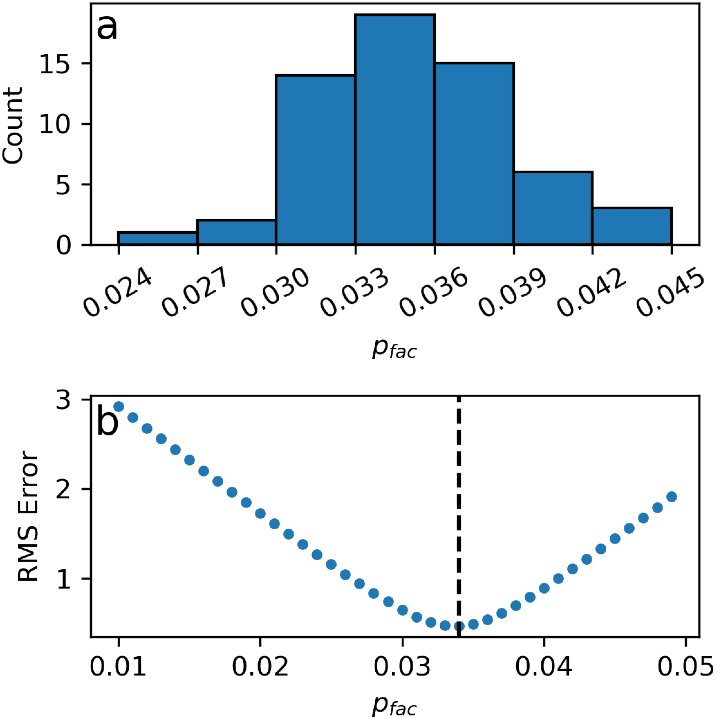 (A) A histogram of individually-determined values for the GOHSNAP optodes shows substantial variability. (B) An example of the root-square-mean (RMS) error between the cal-dip CTD-DO and optode-DO profiles using values of in Equation 3 ranging from 0.01 to 0.05. The value of that minimizes RMS error (here, = 0.0349) is the optimal for a particular optode.