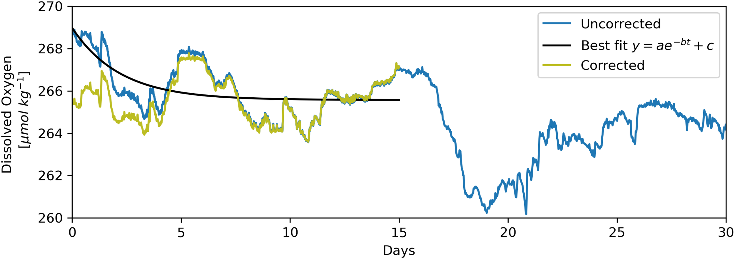 Any optodes deployed below 1,000 m should therefore be checked for reversible drift. If present, we recommend that reversible drift is removed by fitting and subtracting an exponential function of the form fitted to the trace of the drift (Section 5.3). This is a heuristic means of handling reversible drift based on the present understanding of its nature (Berx et al., 2019 and our own dataset) and will likely evolve as more deep-moored optodes are deployed and observations of reversible drift are amassed.