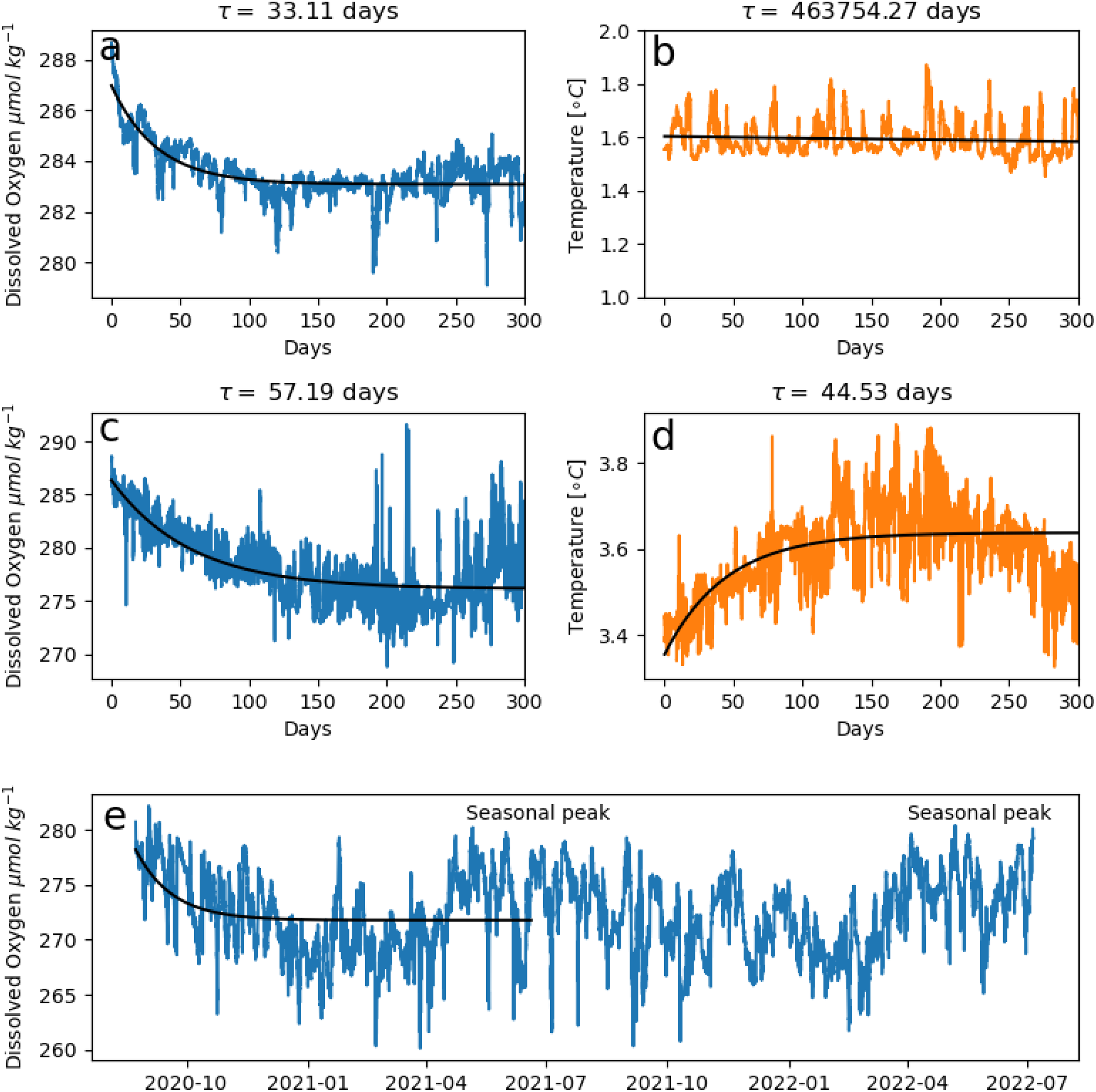 Either no optimal exponential fit is found for the first 15 days of potential temperature, or if an optimal fit is found, τ of the temperature fit is not within several days of τ of the optode-DO fit.