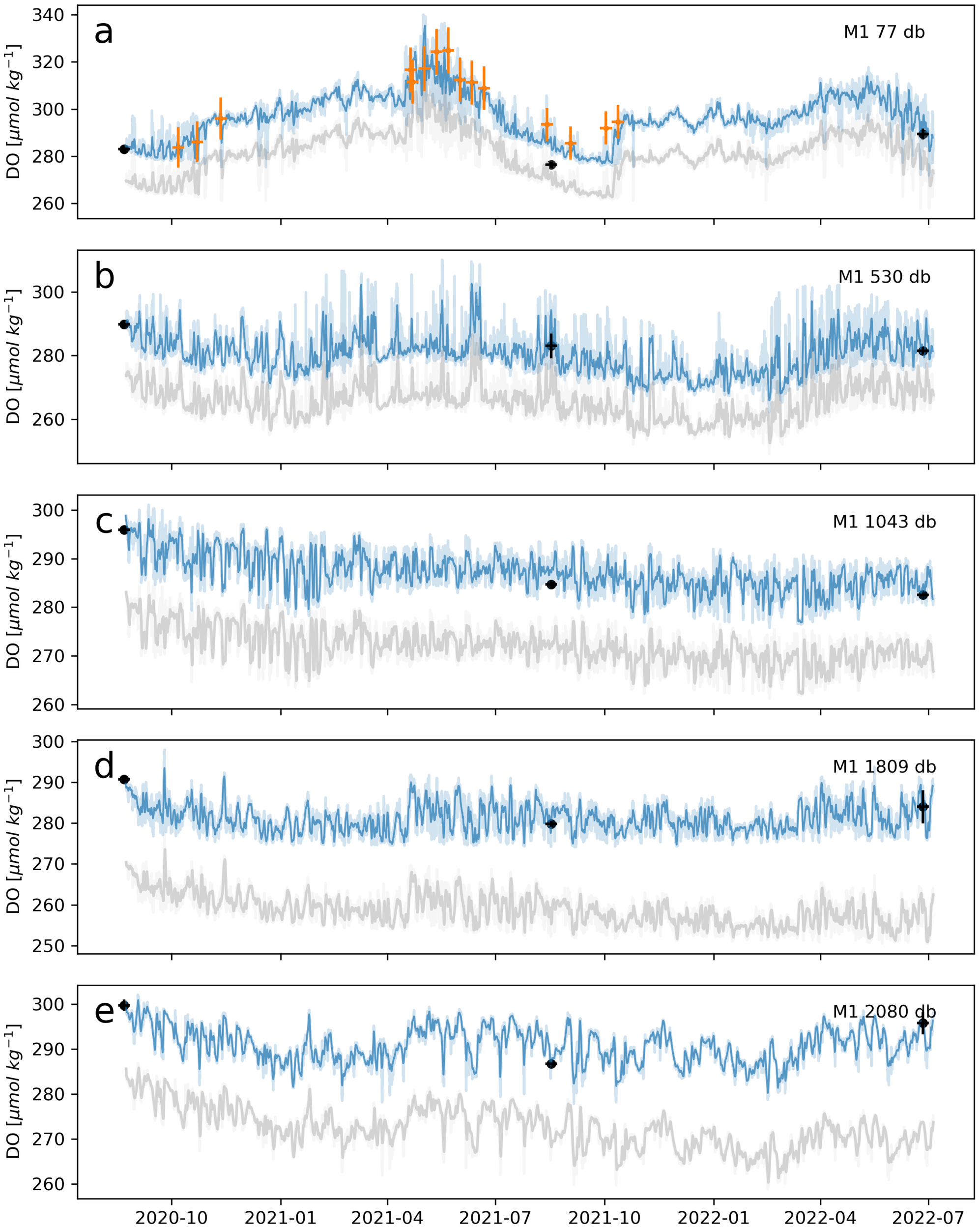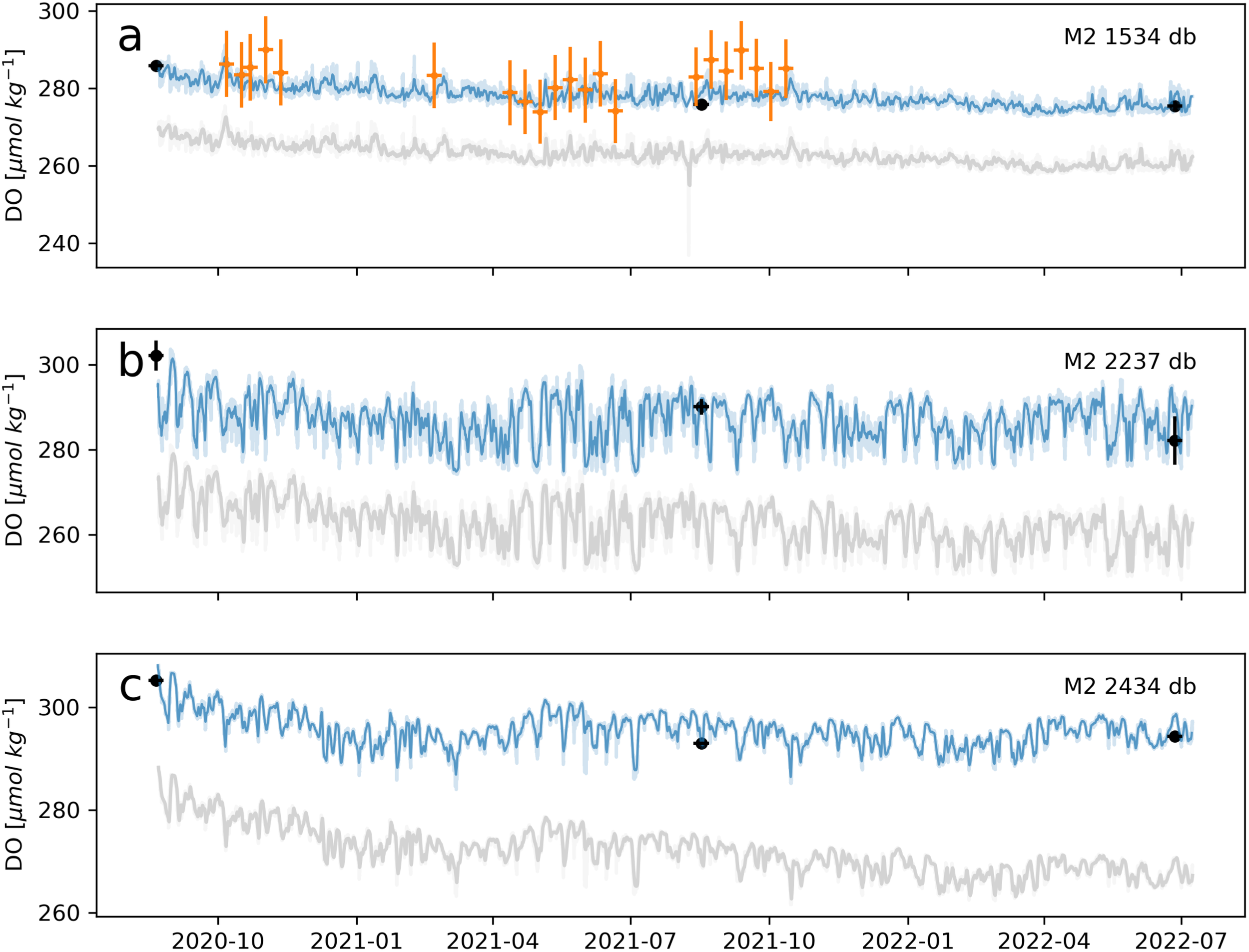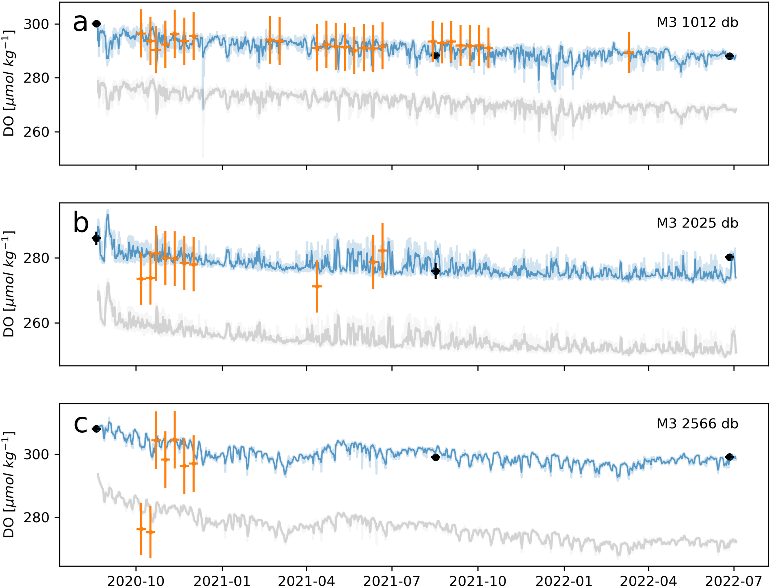 Measurements of dissolved oxygen (DO) concentrations in the ocean can provide valuable information on a number of physical and biogeochemical processes, including the ventilation and circulation of saturated surface waters, respiration and productivity, and temperature-driven changes in gas solubility (Thomas and Joyce, 2010; Stendardo and Gruber, 2012; Oschlies et al., 2018; Palter and Trossman, 2018; Wolf et al., 2018; Dove et al., 2021; Lévy et al., 2022). Furthermore, the ongoing and widespread decline in DO concentrations across the world’s oceans (Diaz and Rosenberg, 2008; Ito et al., 2017; Lévy et al., 2022) poses a significant threat to organisms already living near the edge of their metabolic oxygen demand (Diaz and Rosenberg, 2008; Cheung et al., 2013; Deutsch et al., 2015). For these reasons, measuring DO has become a priority in oceanographic research, prompting the creation of international working groups that promote the collection and dissemination of DO measurements, such as the Global Ocean Oxygen Network (GO2NE), the Scientific Community on Ocean Research (SCOR) Working Group 142 “Quality Control Procedures for Oxygen and Other Biogeochemical Sensors on Floats and Gliders” (Bittig et al., 2018a), and the International Association for the Physical Sciences of the Oceans (IAPSO) Best Practice Study Group on “Ship-based CTD/O2 operations, calibration, and processing procedures”. A key data stream comes in the form of sustained, autonomous time series made possible by the deployment of oxygen sensors on oceanographic moorings (Emerson et al., 2008; Emerson and Stump, 2010; Atamanchuk et al., 2020; Koelling et al., 2022).
