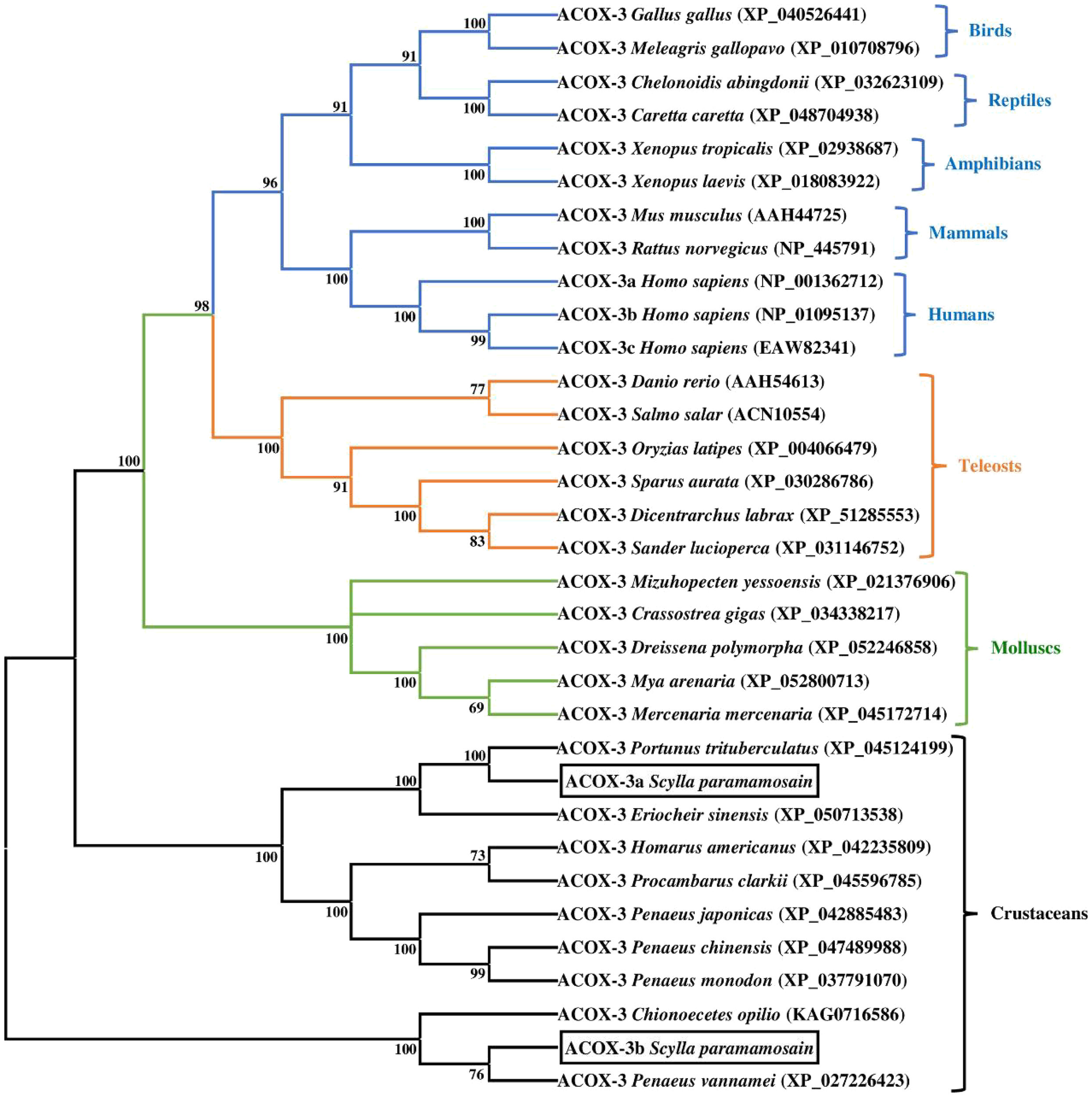 Neighbor-joining phylogenetic tree of representative vertebrate and invertebrate acyl-coenzyme A oxidase 3 (ACOX-3) amino acid sequences. The tree was constructed using the neighbor joining method with MEGA 7.0. The horizontal branch length is proportional to amino acid substitution rate per site. Numbers represent the frequencies with which the tree topology presented was replicated after 1000 bootstrap iterations.