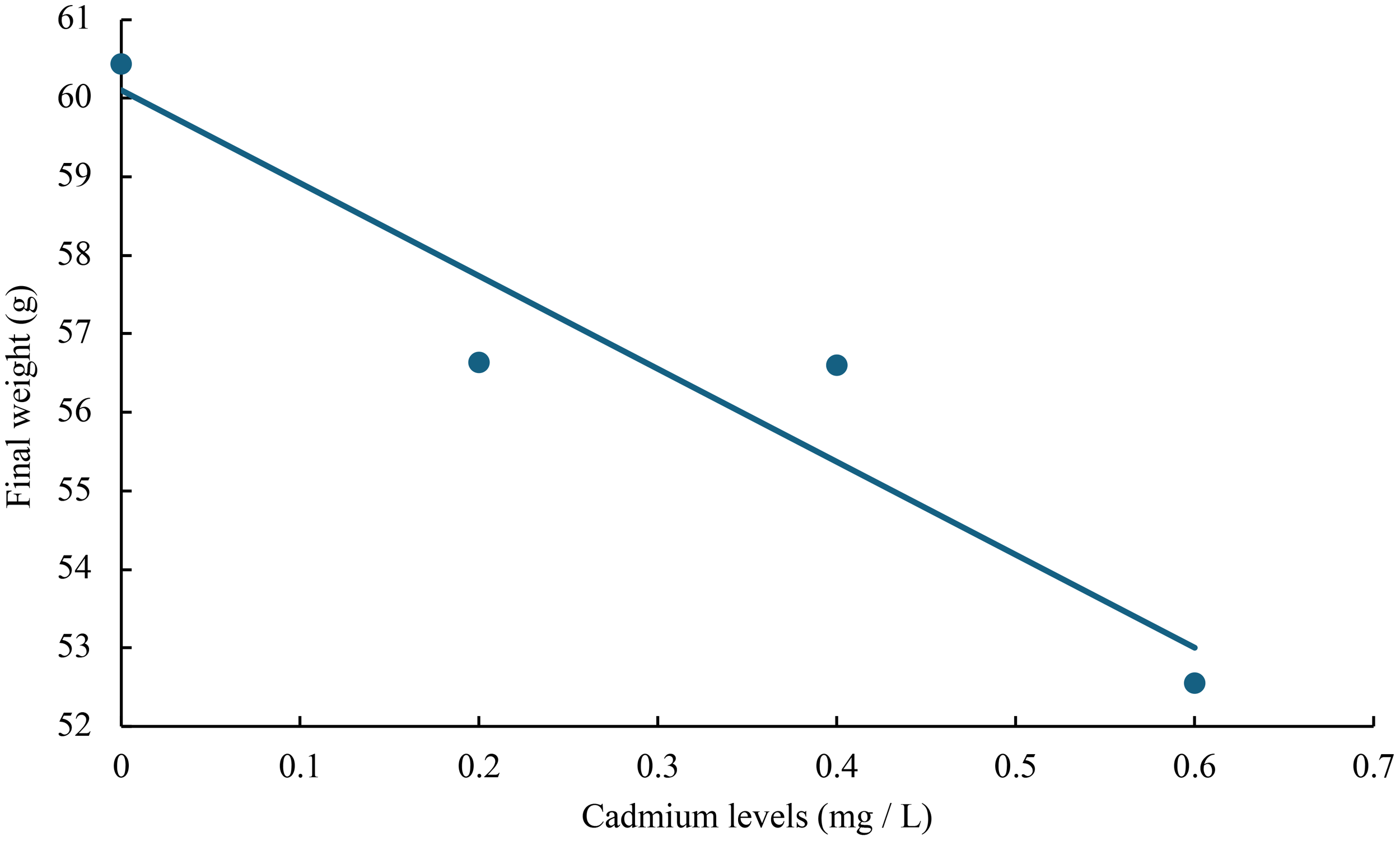 Relationship between cadmium levels and final weight of juvenile GIFT based on a linear regression analysis, in which Y = -11.835X + 60.103, R2 = 0.9018.