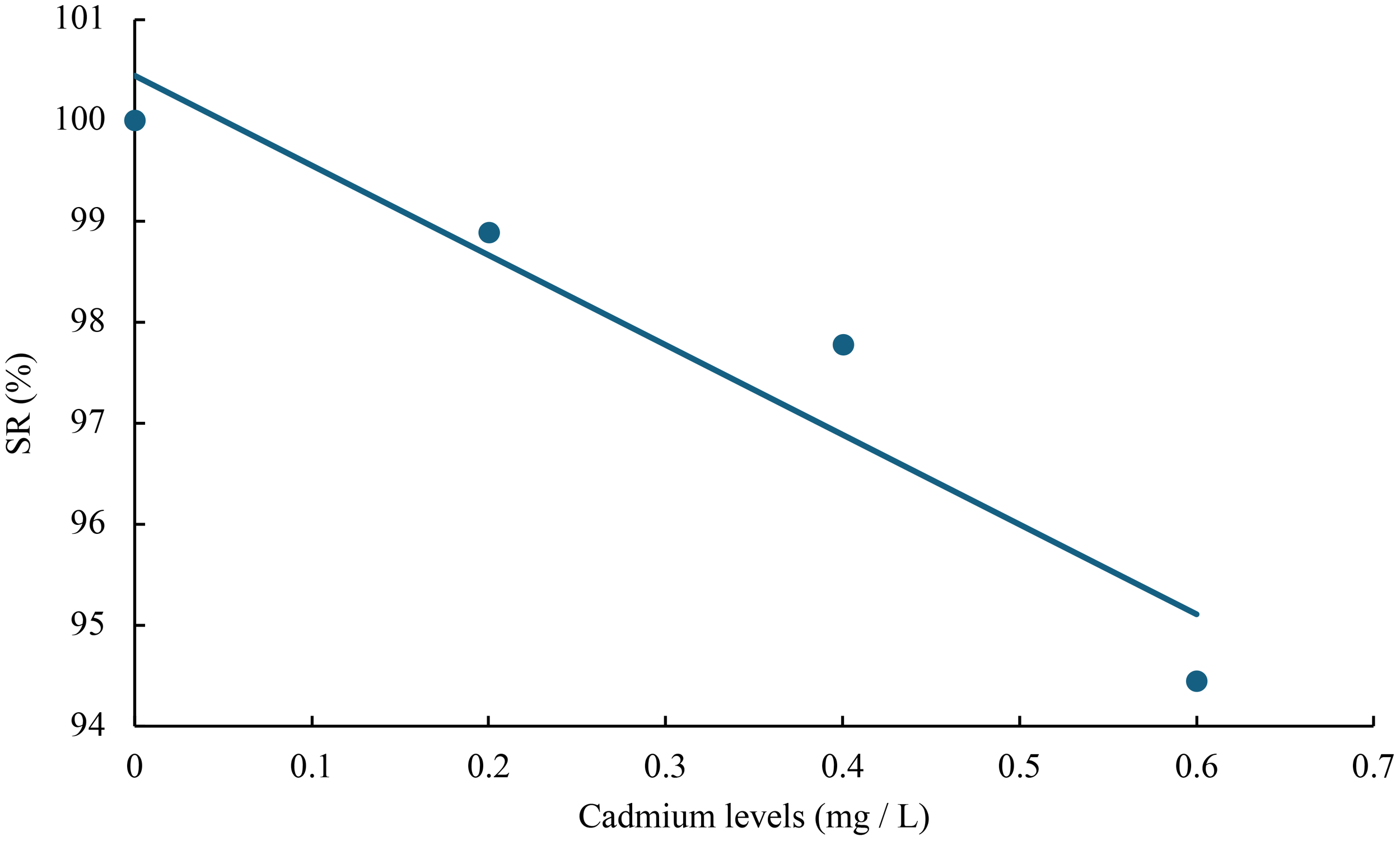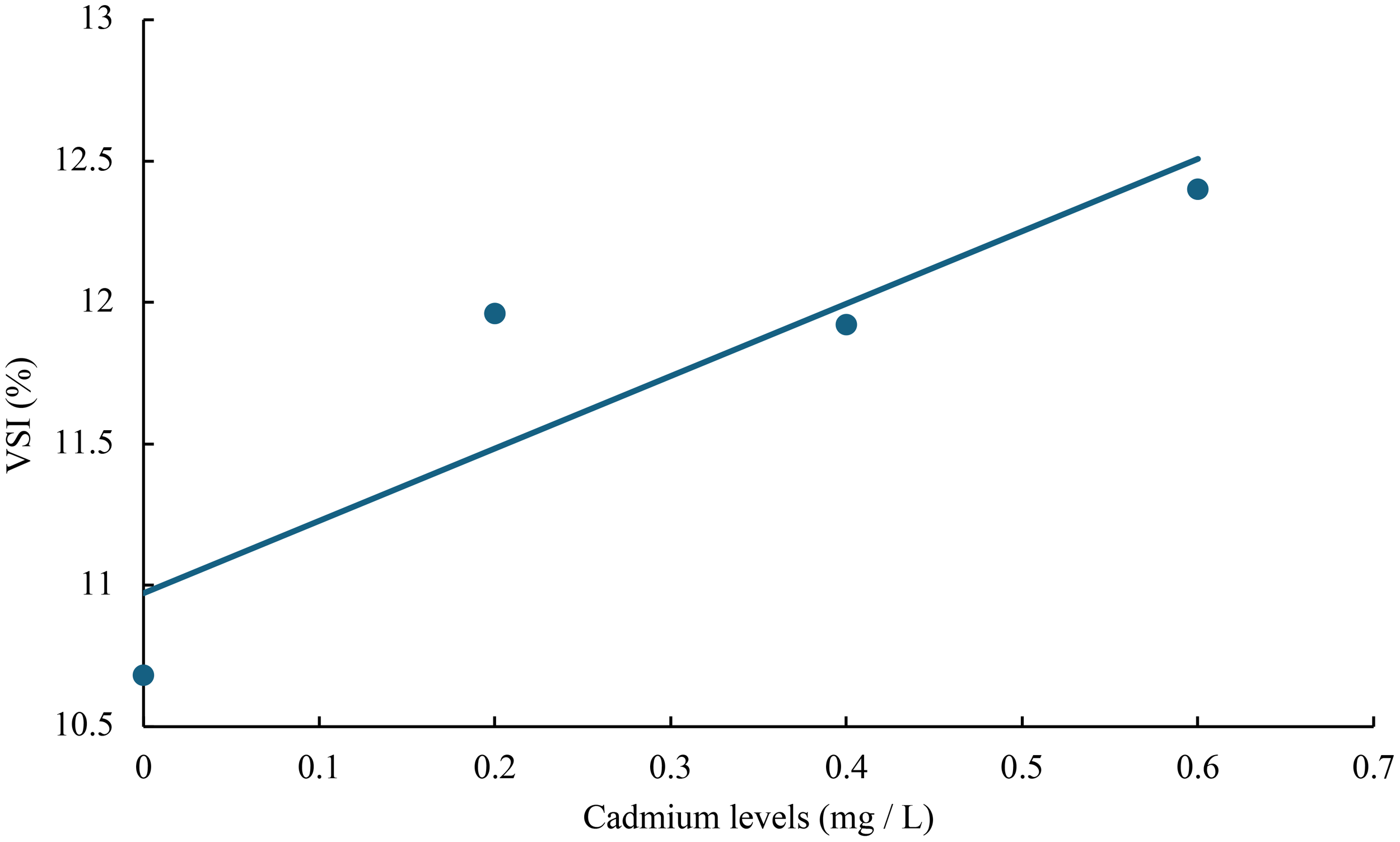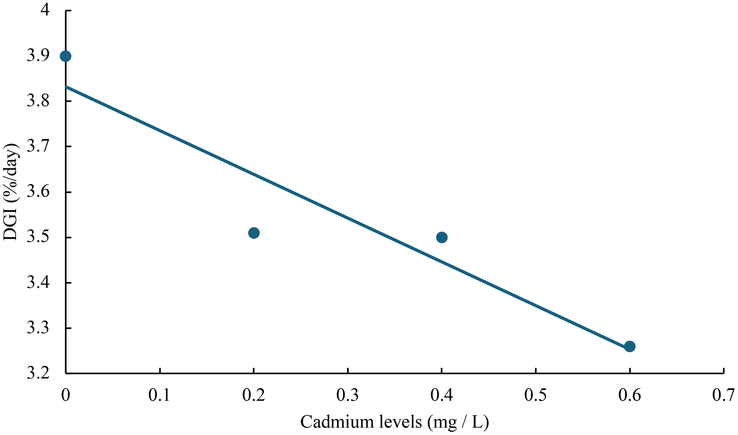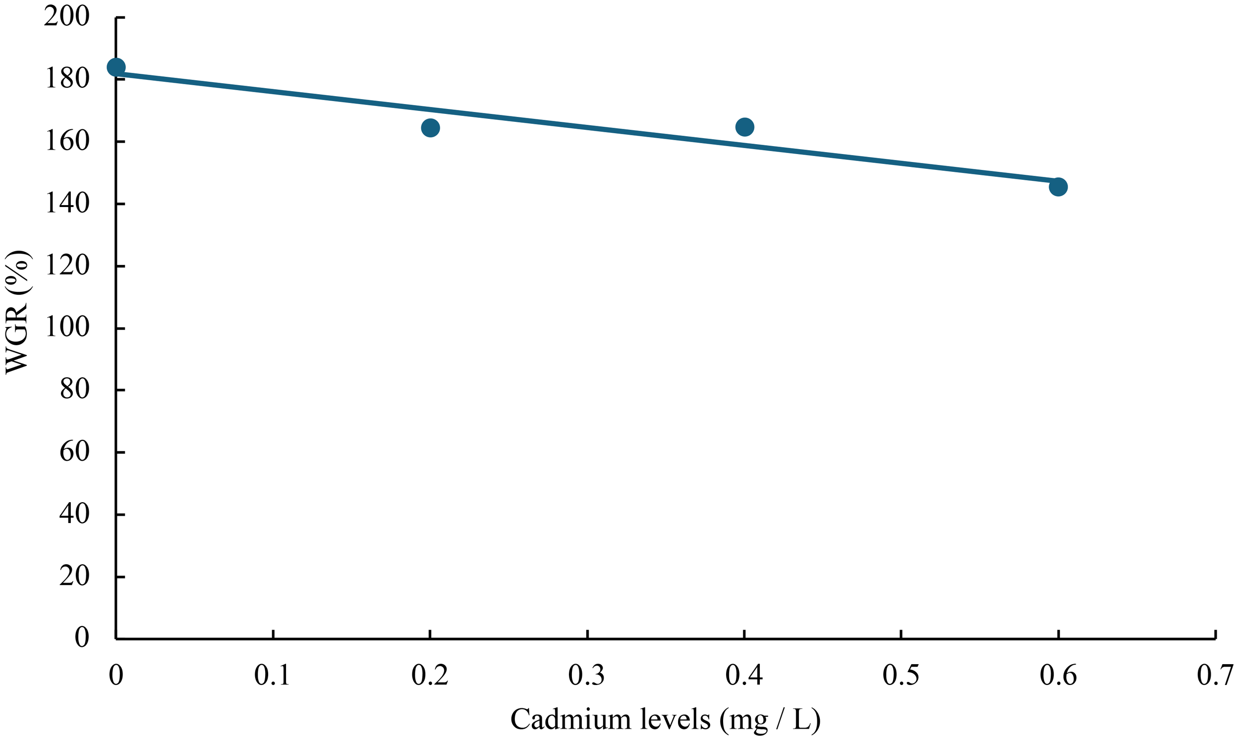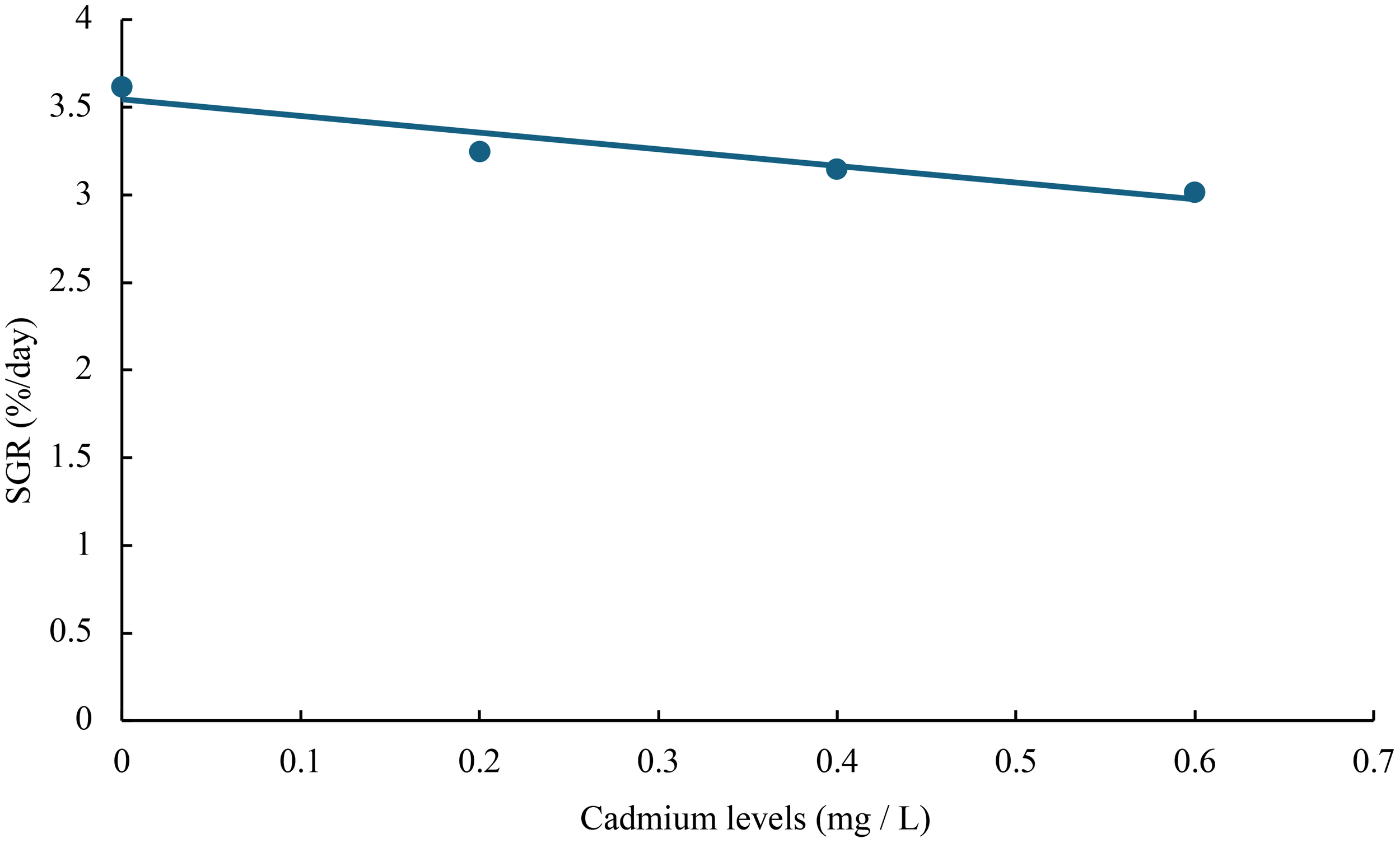 The relationship between cadmium levels and final weight, WGR, SGR, DGI, BLG, CF, HSI, VSI, FCR, and SR of juvenile GIFT was shown in Figures 1-10 based on a linear regression analysis, in which the order of coefficient of determination (R2) from largest to smallest was: R2 (FCR) > R2 (SR) > R2 (SGR) > R2 (final weight) > R2 (WGR) > R2 (DGI) > R2 (BLG) > R2 (HSI) > R2 (VSI) > R2 (CF).