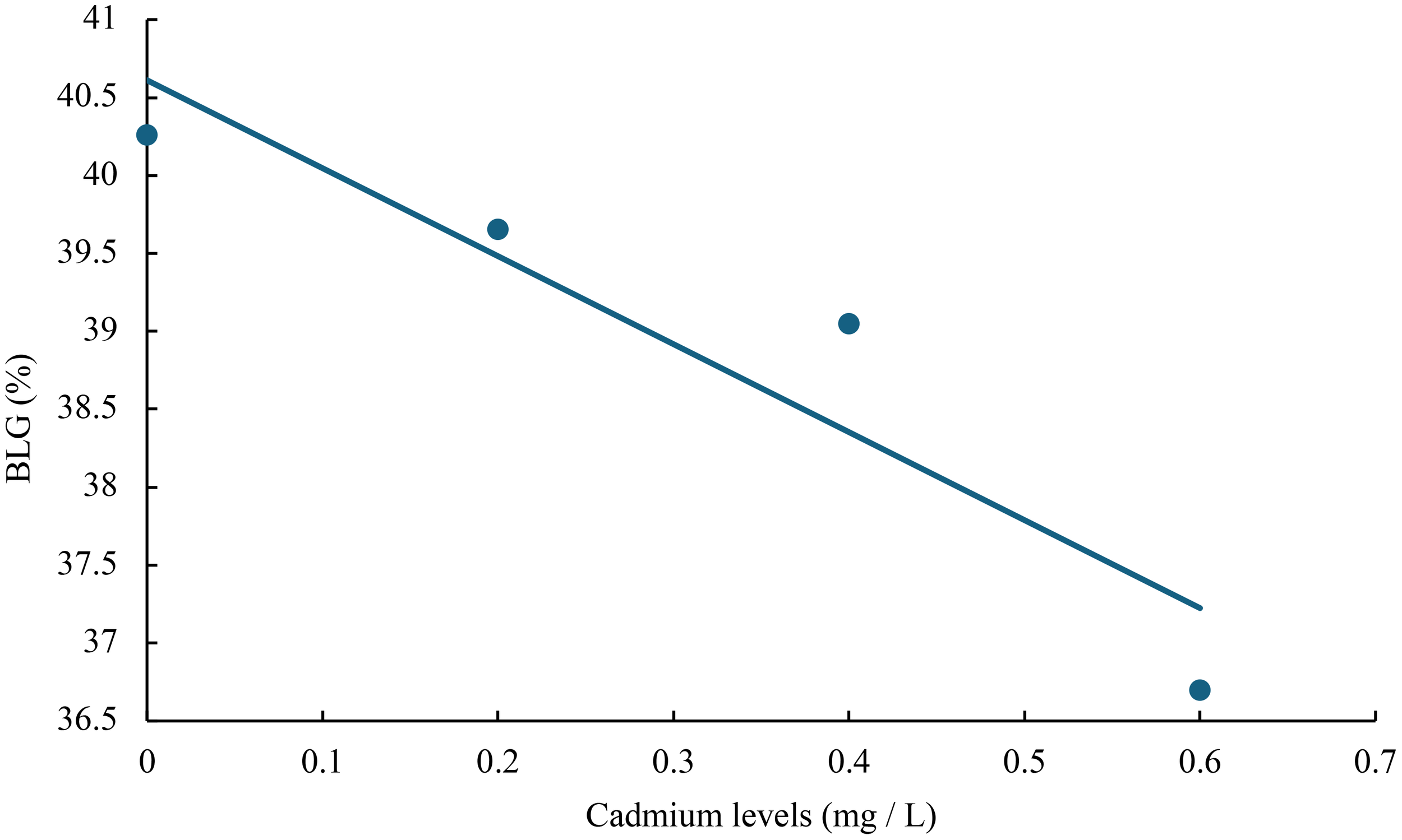 There was no significant difference (p > 0.05) between 0, 0.2, 0.4, and 0.6 mg/L Cd2+ groups on the body length gain rate (BLG), as shown in Table 2.