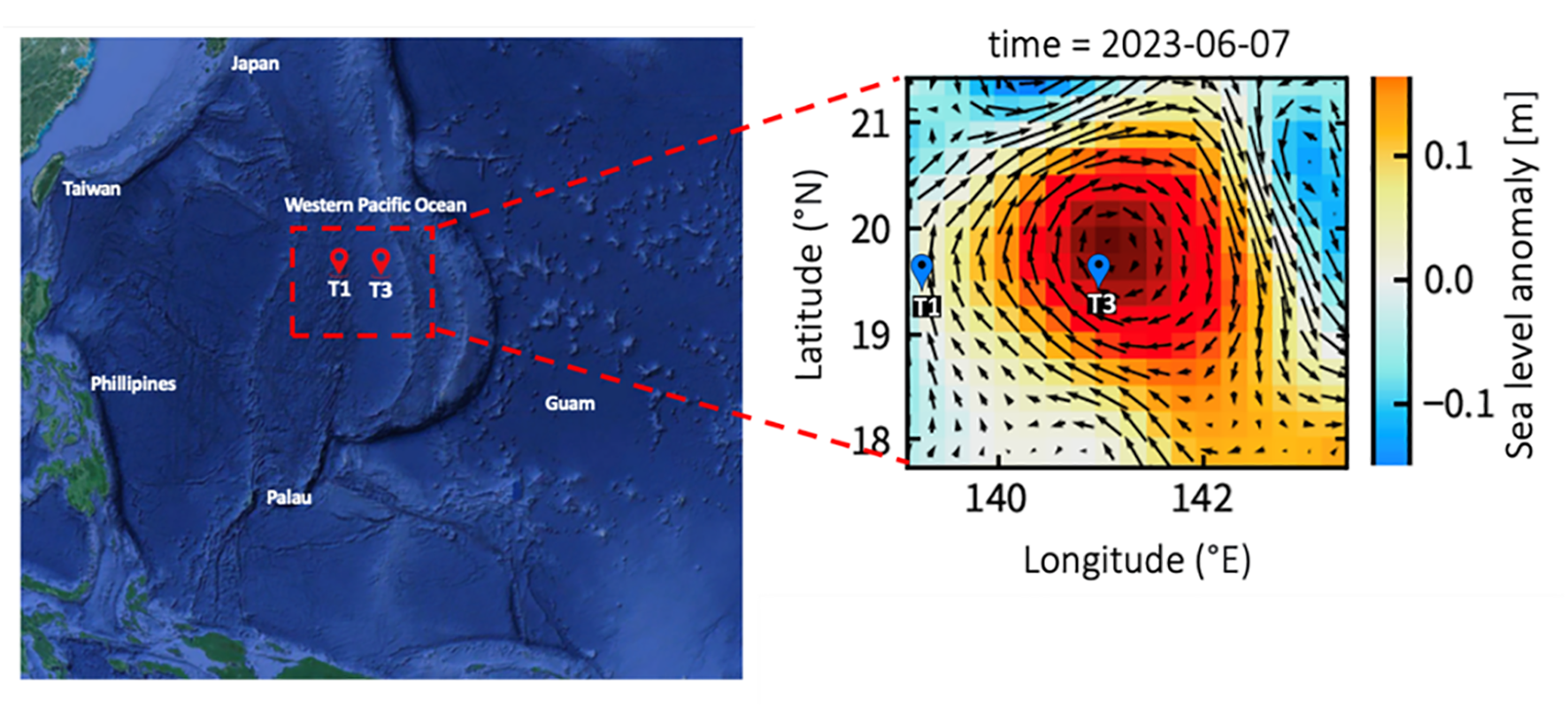 This map shows the sampling stations plotted against the averaged sea surface height anomaly (m) for the study period of 2023. The arrows represent sea surface currents.