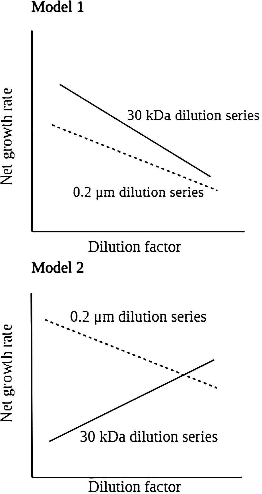 Model for idealized dilution plots and analysis when filtered water containing viruses (standard protocol used to determine grazing rates) and viral-free water are used to dilute whole water in the incubations that make up each dilution series.