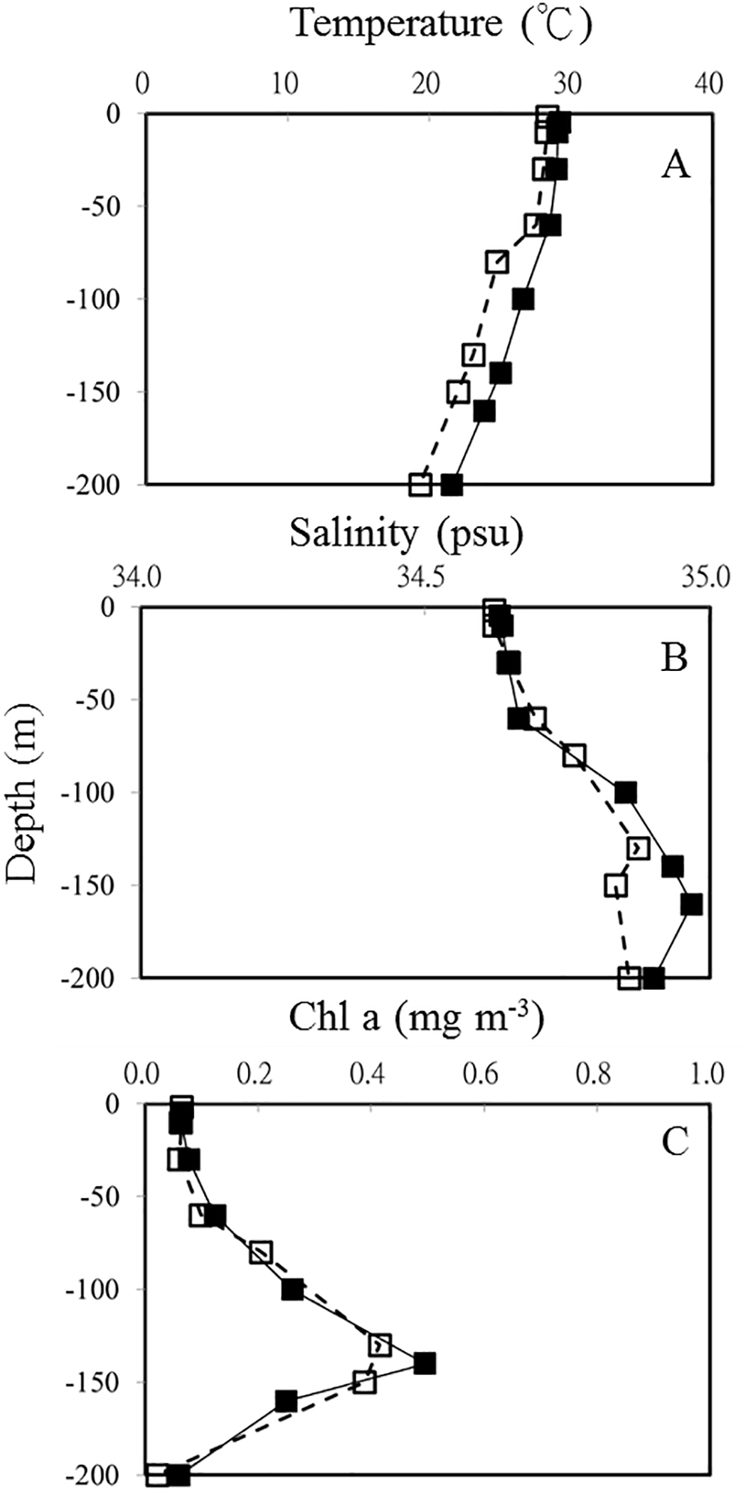 Vertical profiles of temperature (A) salinity (B) and Chl a(C) in OE (â–¡) and EC (â–ª), respectively.