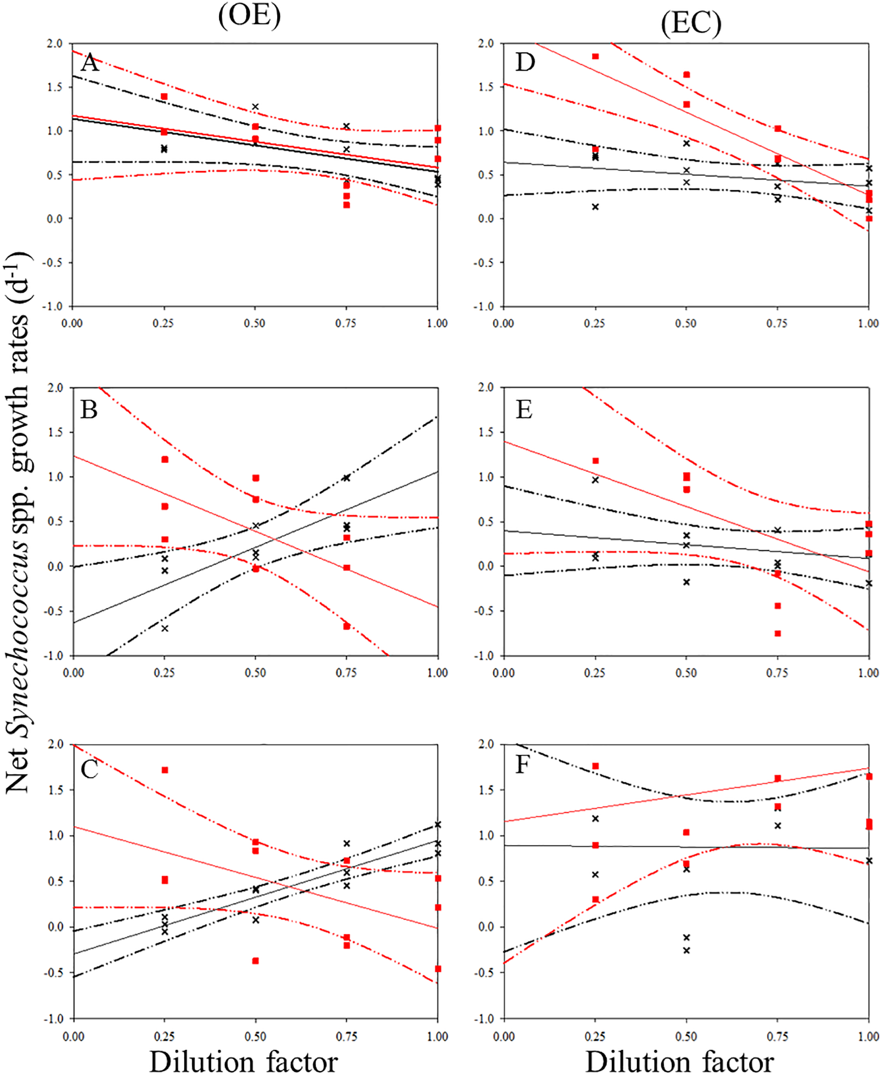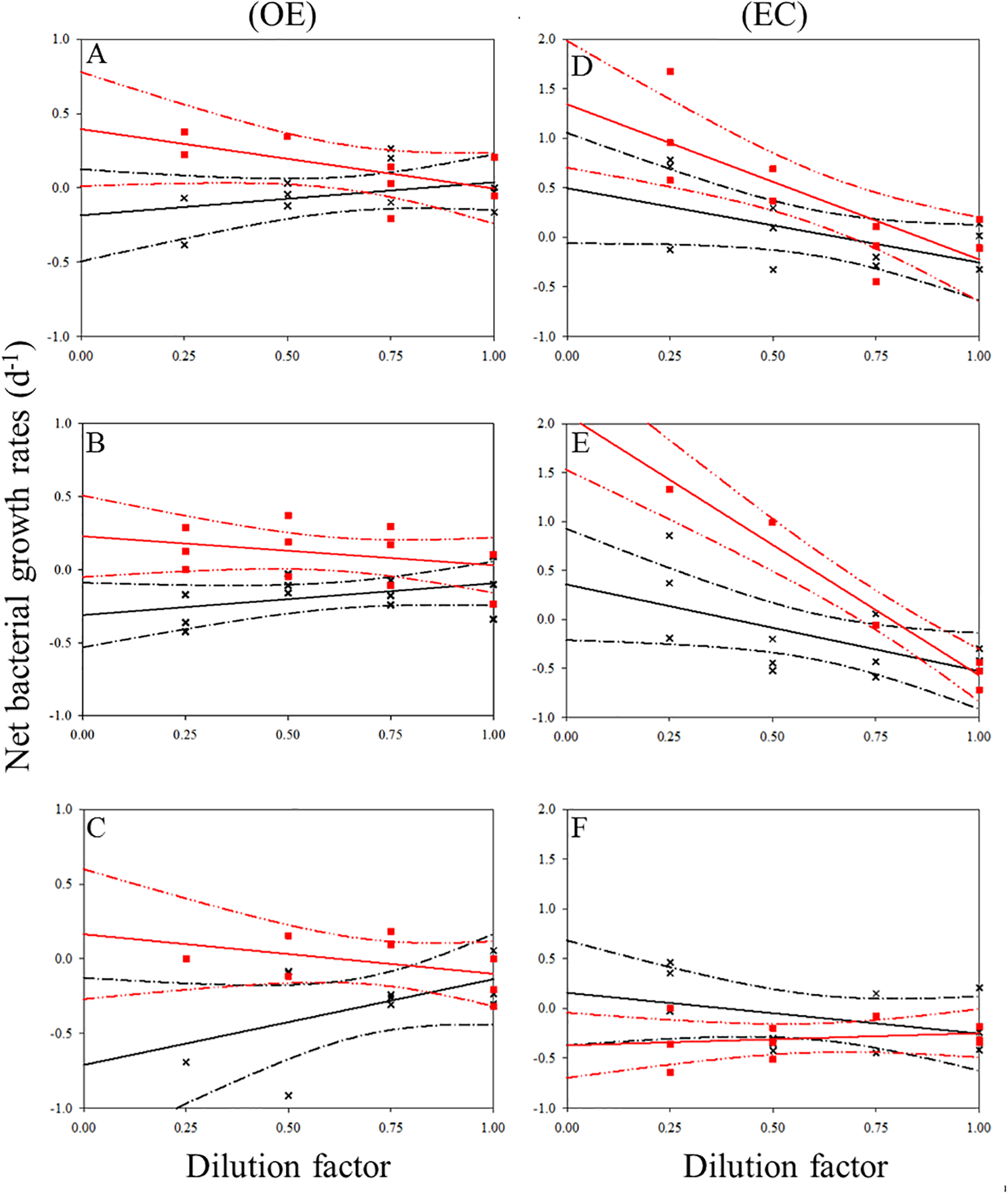 Dilution plots of net bacterial growth rate (d−1) versus seawater fraction in parallel experiments in OE and EC. Cross and closed squares represent growth rates from the 0.2 μm (black line) and 30 kDa (red line) dilution series, respectively. (A) surface, (B) DCM layer (C) 200 m in OE, and (D) surface, (E) DCM layer (F) 200 m in EC, respectively. Dash line: 95% confidence intervals.