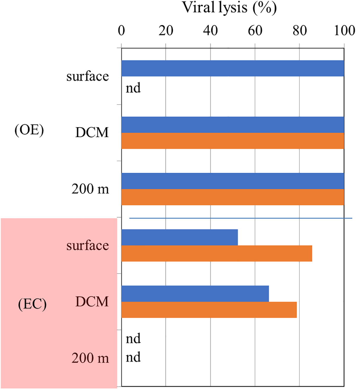 The vertical distribution of Chl a concentration at OE and EC showed that the depth of DCM was at 130 m and 140 m, respectively (Table 1; Figure 3C). A warm eddy inside surface water showed similar chlorophyll a concentration as outside, while phytoplankton biomass in the DCM and 200 m depth layer of EC were higher than that in OE (Table 1; Figure 2C). We observed a similar amount of phytoplankton biomass (Chl a) was observed between EC and OE surface stations, however, there was a significant difference in the phytoplankton community structure between them in surface water. In EC surface samples, PEUK abundance was very low (<100 cells mL-1), and SYNE was the most abundant picophytoplankton (32.3 ± 3.21 x 103 cells mL-1), with contributions of 63% (Table 1). Moreover, in OE surface samples, the picophytoplankton community was also dominated by SYNE (6.9 ± 0.86 x 103 cells mL-1), with increased a contribution of up to 90% (Table 1). At DCM layer, abundance of PRO and SYNE in the EC (3.8 ± 0.59 and 4.4 ± 0.45 × 103 cells ml-1, respectively) was significantly lower (p<0.05) than that of the OE (13.8 ± 0.69, and 19.7 ± 3.34 × 103 cells ml-1, respectively) (Table 1). Similarly, in OE region, the abundance of HB, nanoflagellate and viruses at DCM samples was higher than that in EC (Table 1). At the EC station, however, there were no significant vertical differences in the abundance of HB, nanoflagellates, and viruses (Table 1).