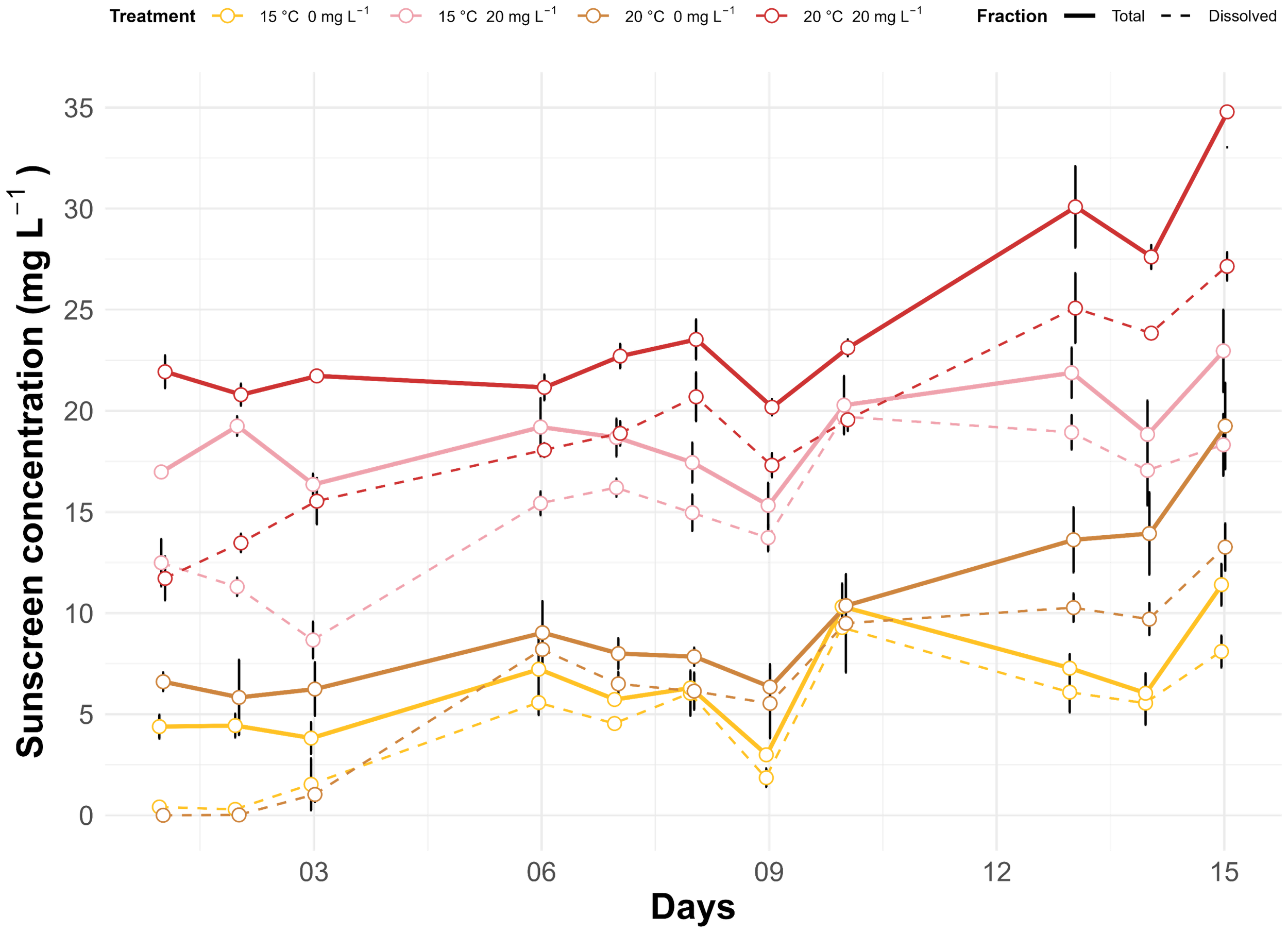 Average concentrations (n=3) of the total and dissolved fractions of commercial sunscreens in the seawater of the aquaria under different treatments during the incubation period. Error bars represent ± standard error.