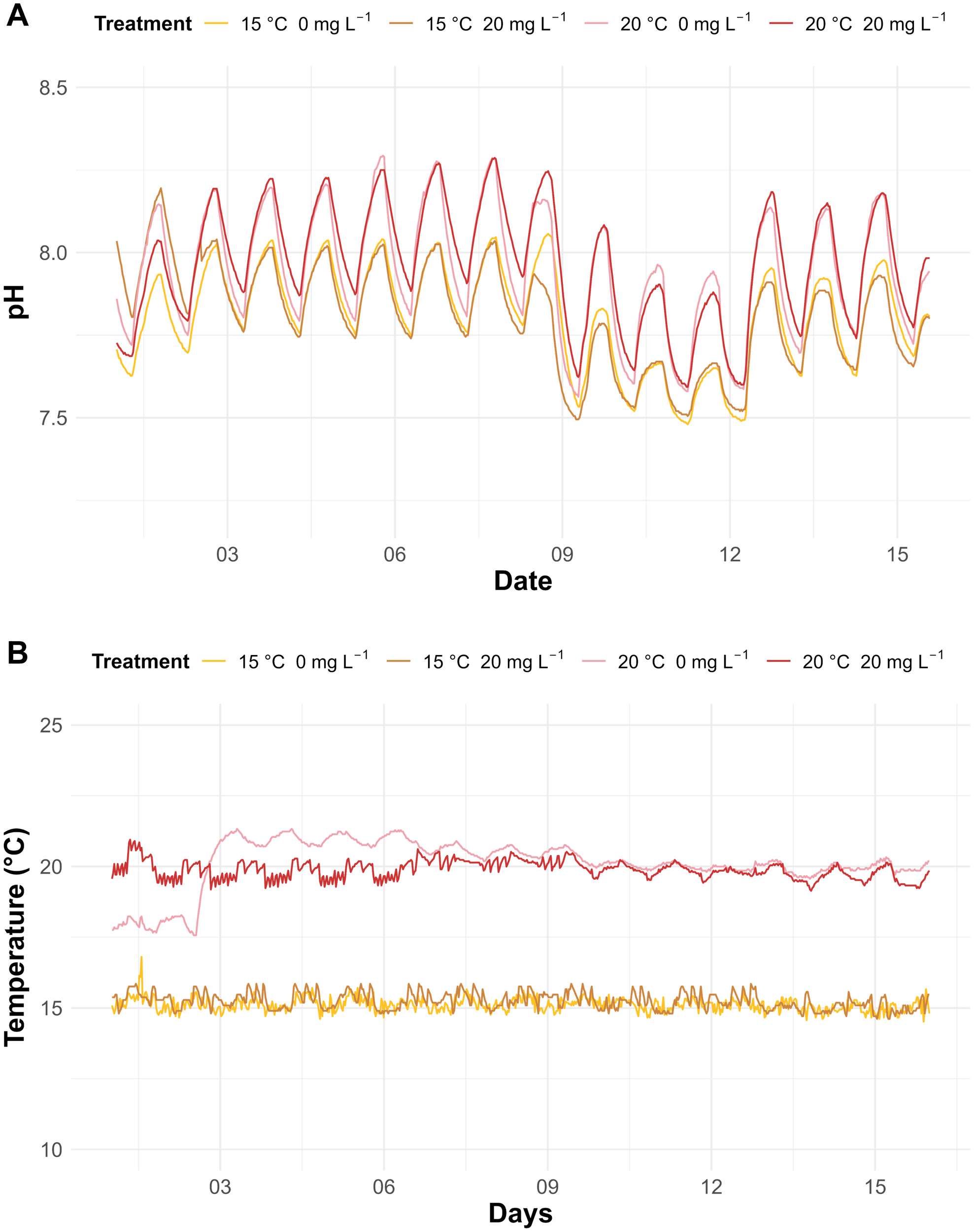 Diurnal changes in the seawater pH (A) and temperature (B) of the treatments during the experiment.