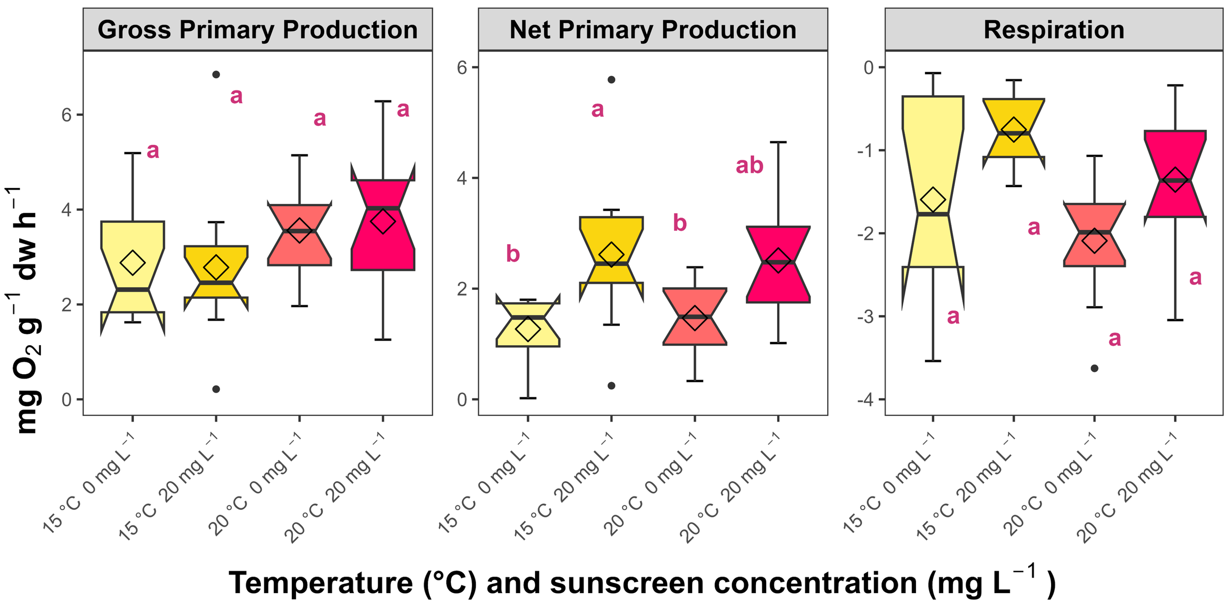 Average gross primary productivity, net primary productivity, and respiration of Posidonia oceanica in the treatments (n=6). Error bars represent ± standard deviation, while notches correspond with confidence intervals around medians and rhombi are mean values. Different letters reflect significant differences (p<0.05) among treatments (Tukey test).