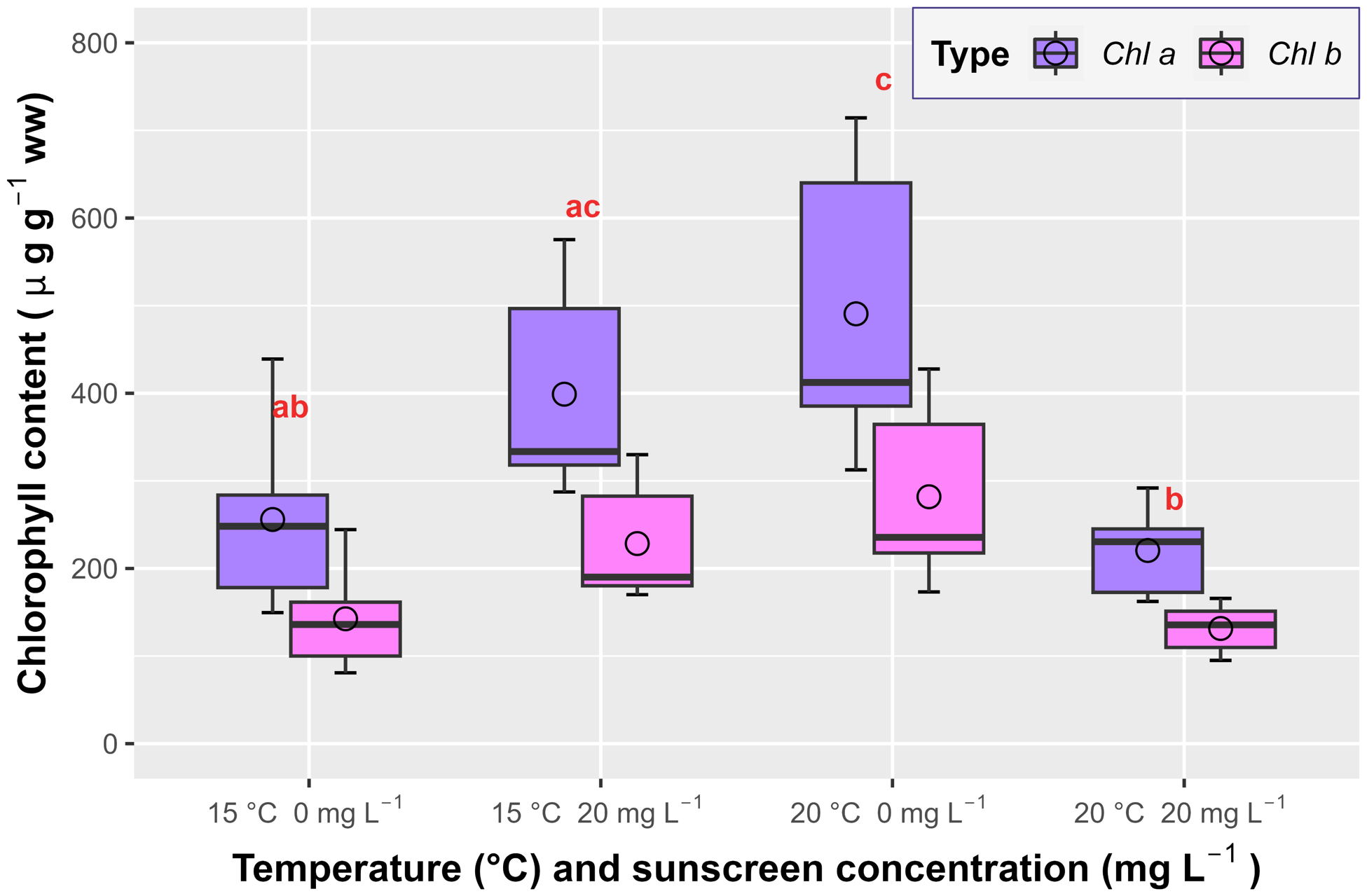 Sunscreen exposure combined with elevated temperature induced a ~50% decrease in the total chlorophyll of P. oceanica (p<0.001; Figure 4), including chlorophyll a and b, with an average of 352.02 ± 82.31 µg g-1 ww, from 772.53 ± 281.36 µg g-1 ww under elevated temperature alone and 627.33 ± 199.60 µg g-1 ww at ambient temperature and 20 mg L-1 of sunscreen addition. Chlorophyll contents in the ambient temperature treatment without sunscreen (398.45 ± 165.28 µg g-1 ww) only differed (p<0.001) from those under elevated temperature alone, that overall exhibited greater chlorophyll production.