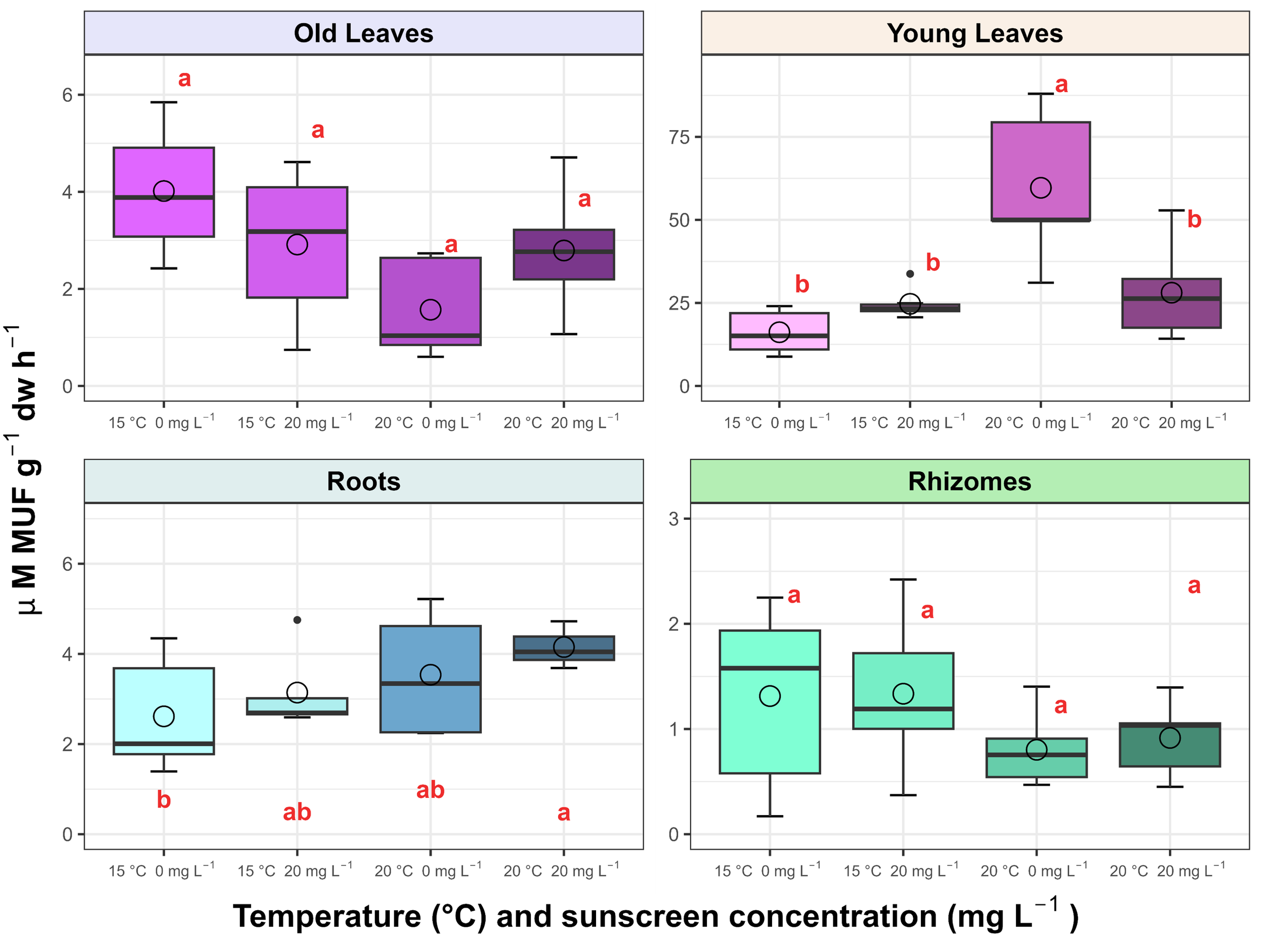 The APA associated with P. oceanica young leaves and roots responded differently to the treatments (p<0.01). Under elevated temperature, sunscreen exposure seemed to inhibit the activity of the enzyme in the young leaves (Figure 5), with a 50% decrease from 59.66 ± 23.43 µM MUF g-1 dw h-1 without sunscreen, to 28.07 ± 14.28 µM MUF g-1 dw h-1. For the roots, APA rates were enhanced by the interaction of sunscreen addition with elevated temperature, showing increased rates by four-fold in this treatment (10.42 ± 9.23 µM MUF g-1 dw h-1) in comparison to those at ambient temperature and 0 mg L-1 of sunscreen (2.61 ± 1.31 µM MUF g-1 dw h-1). In general, the highest rates (p<0.001) per tissue corresponded to the young leaves (31.63 ± 20.69 µM MUF g-1 dw h-1), followed by the roots and old leaves (6.20 ± 6.74 and 3.25 ± 2.31 µM MUF g-1 dw h-1, respectively), and the lowest were evidenced in the rhizomes (1.19 ± 0.76 µM MUF g-1 dw h-1).