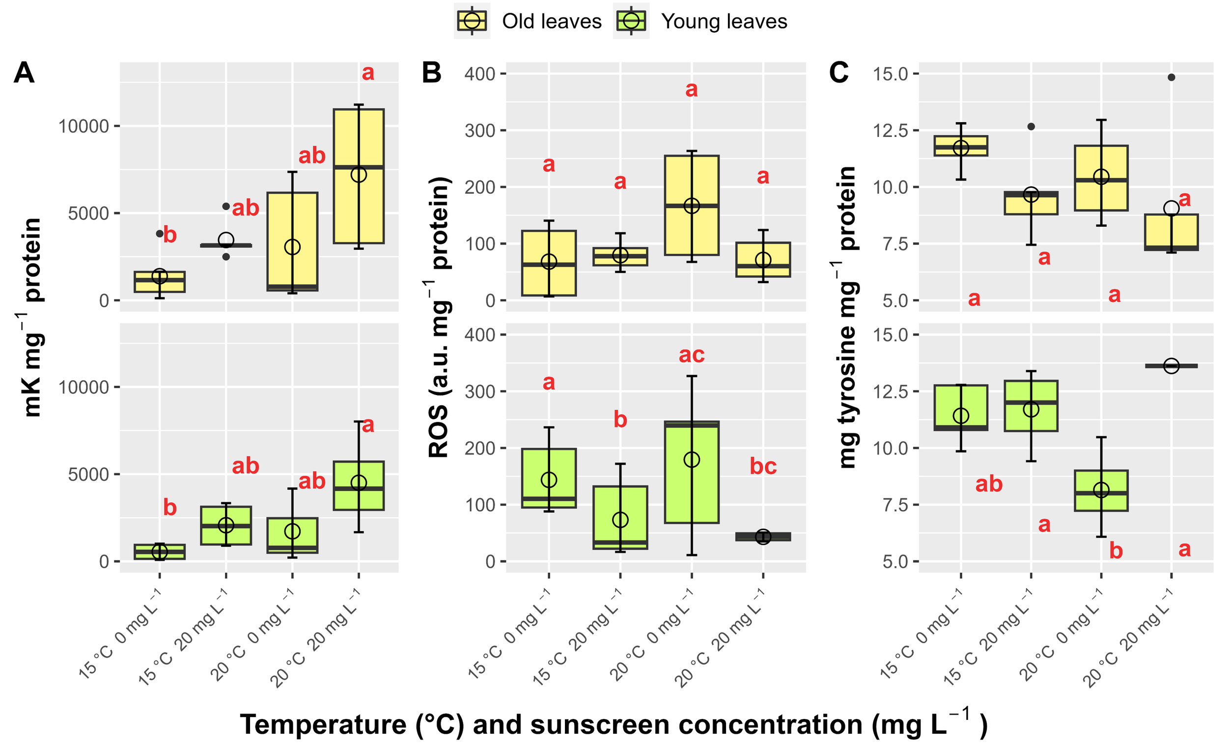 Greater antioxidant defenses were induced in P. oceanica leaves by the combined treatments of sunscreen addition and elevated temperature (p<0.05; Figure 6). Catalase rates were incremented in old and young leaves under this treatment (7207 ± 3991 and 4503 ± 2699 mK mg-1 protein, respectively) in comparison to those at ambient temperature without sunscreen exposure (1383 ± 1346 and 546 ± 490 mK mg-1 protein, respectively). Comparing the elevated temperature treatments only, polyphenols concentrations in young leaves increased by ~100% with the addition of sunscreen, from 8.15 ± 1.57 to 16.16 ± 1.33 mg tyrosine mg-1 protein. Sunscreen exposure at ambient temperature promoted higher ROS production in young leaves (227.81 ± 58.68 a.u. mg-1 protein) than in both temperature conditions without sunscreen (48.73 ± 36.75 and 39.32 ± 21.93 a.u. mg-1 protein at 15 and 20°C, respectively).