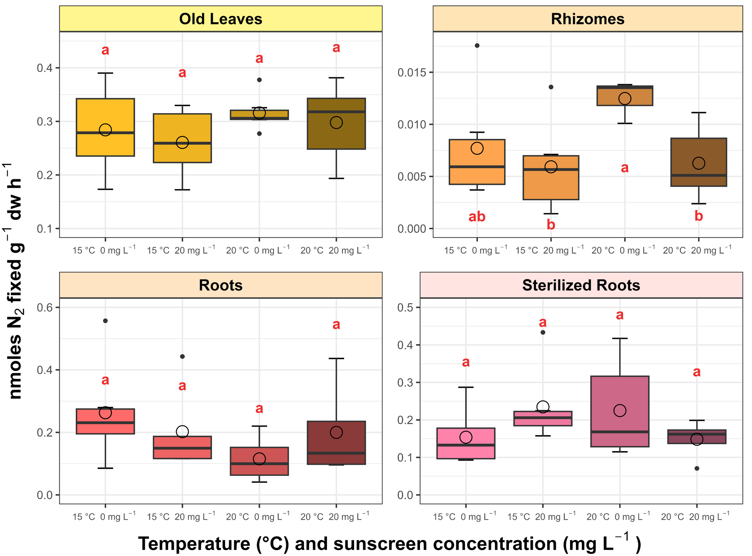 Average N2 fixation rates associated with Posidonia oceanica leaves, roots and rhizomes incubated in the treatments (n=6). Error bars represent ± standard deviation and circles correspond with mean values. Different letters reflect significant differences (p<0.05) among treatments (Tukey test).