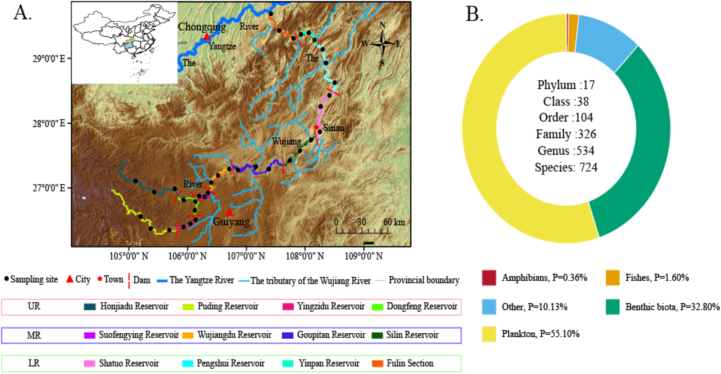 Study area (A) and total percentage of the five major taxa in the Wujiang River mainstem (B).