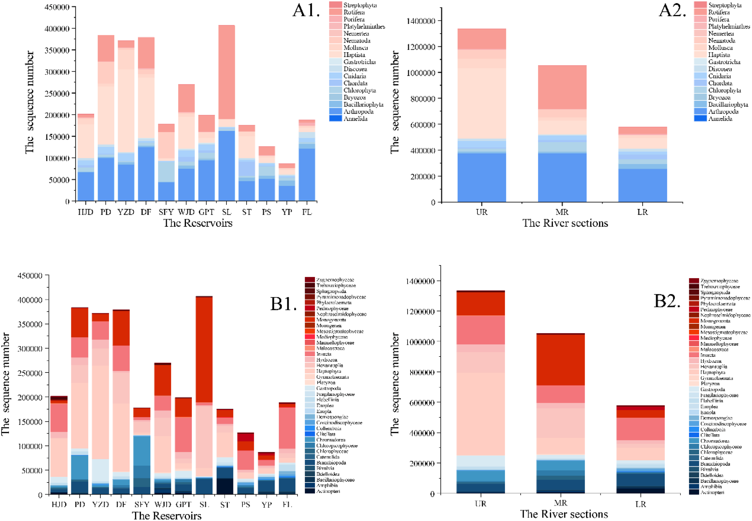 Histograms of sequence number at phylum level (A1, A2) and class level (B1, B2) for each river section and reservoir area.