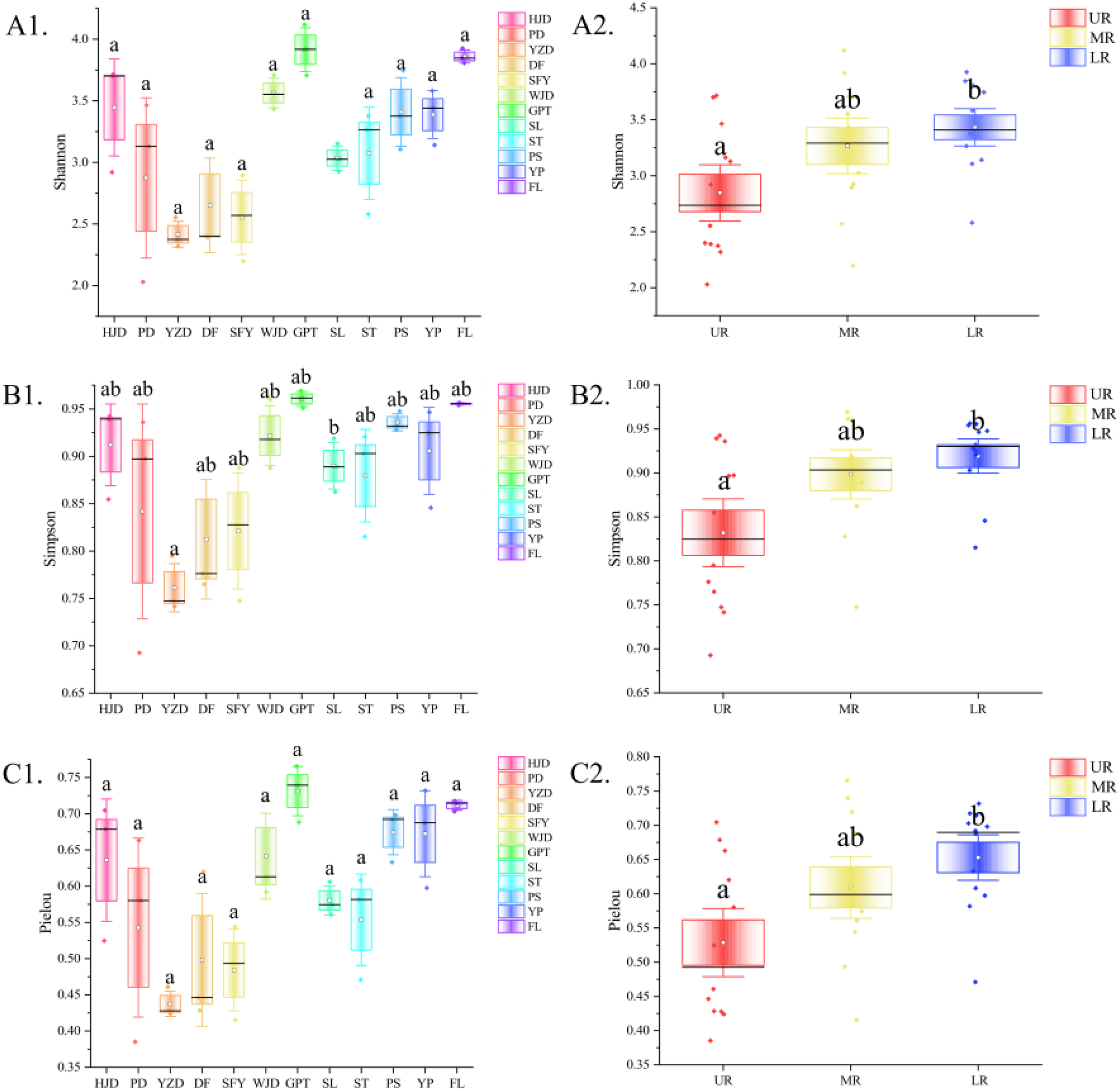 Alpha diversity indices and their differences (significant differences are indicated by the absence of the same letter) for each reservoir area (A1, B1, C1) and river section (A2, B2, C2).