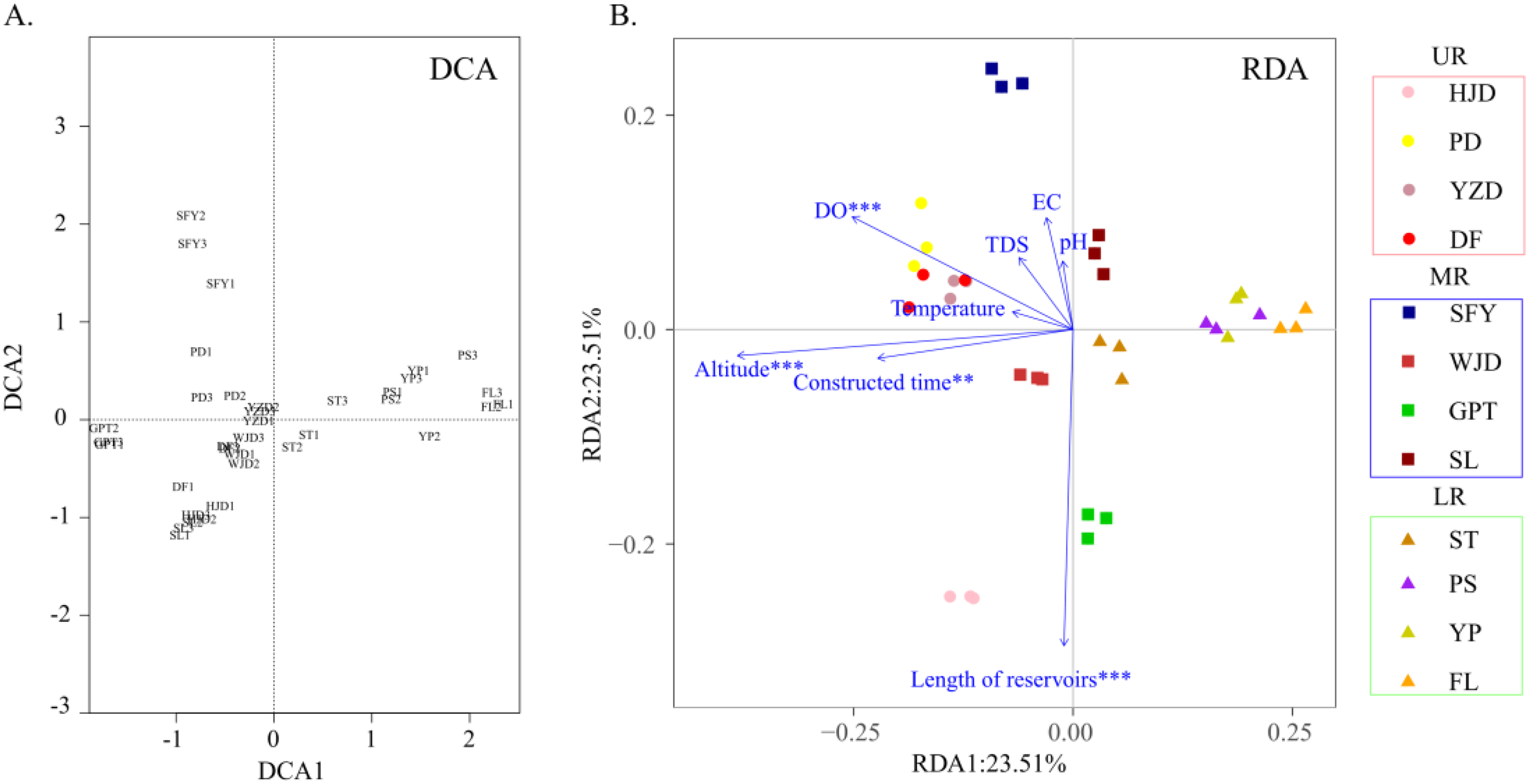 The NMDS analysis based on the Bray-Curtis distance was performed to demonstrate the similarity of total taxonomic level diversity in the UR, MR and LR of the Wujiang River mainstem. Additionally, permutational multivariate analysis of variance (PERMANOVA) utilizing the vegan function adonis with 999 free permutations, and it was used to assess the differences in aquatic biodiversity across the aforementioned river reaches. Meanwhile, in each sampling section, after Decision Curve Analysis (DCA), we found that the value of the first axis was less than 4, hence we proceeded with Redundancy Analysis (RDA) for the correlation analysis between environmental factors and the aquatic biological community. All statistical analyses were conducted using R v. 4.0.3.