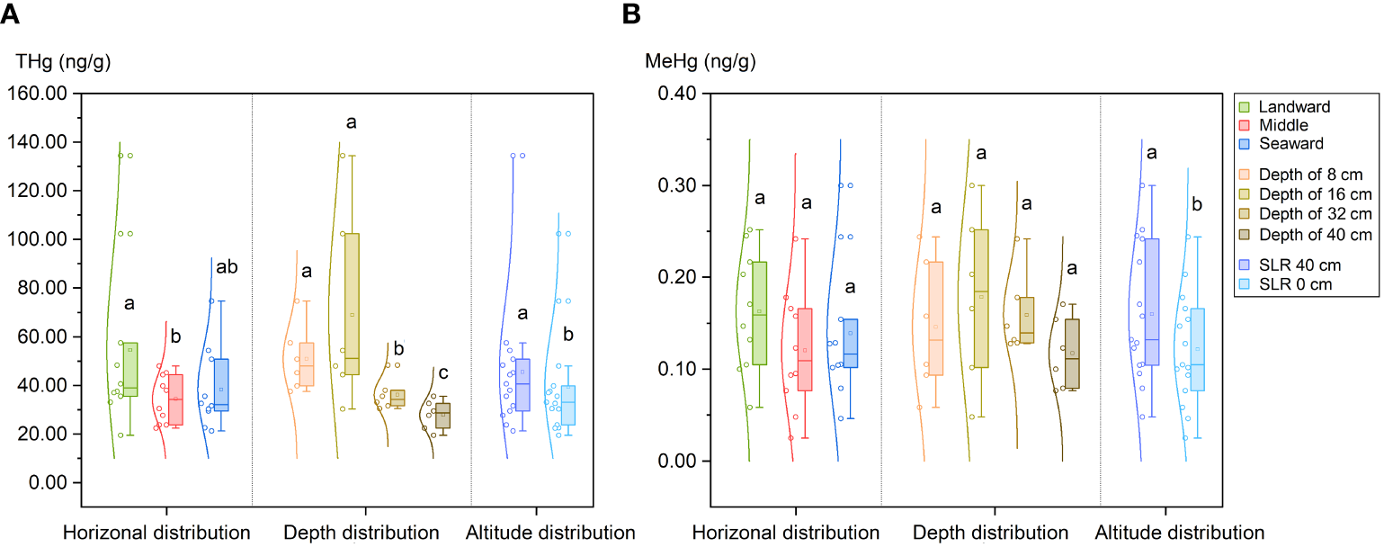 Mercury distribution in sediments of planted K. obovata forests. (A) Distribution of total mercury (THg); (B) Distribution of methyl mercury (MeHg). Different lowercase letters denote statistically significant differences between groups (p<0.05).