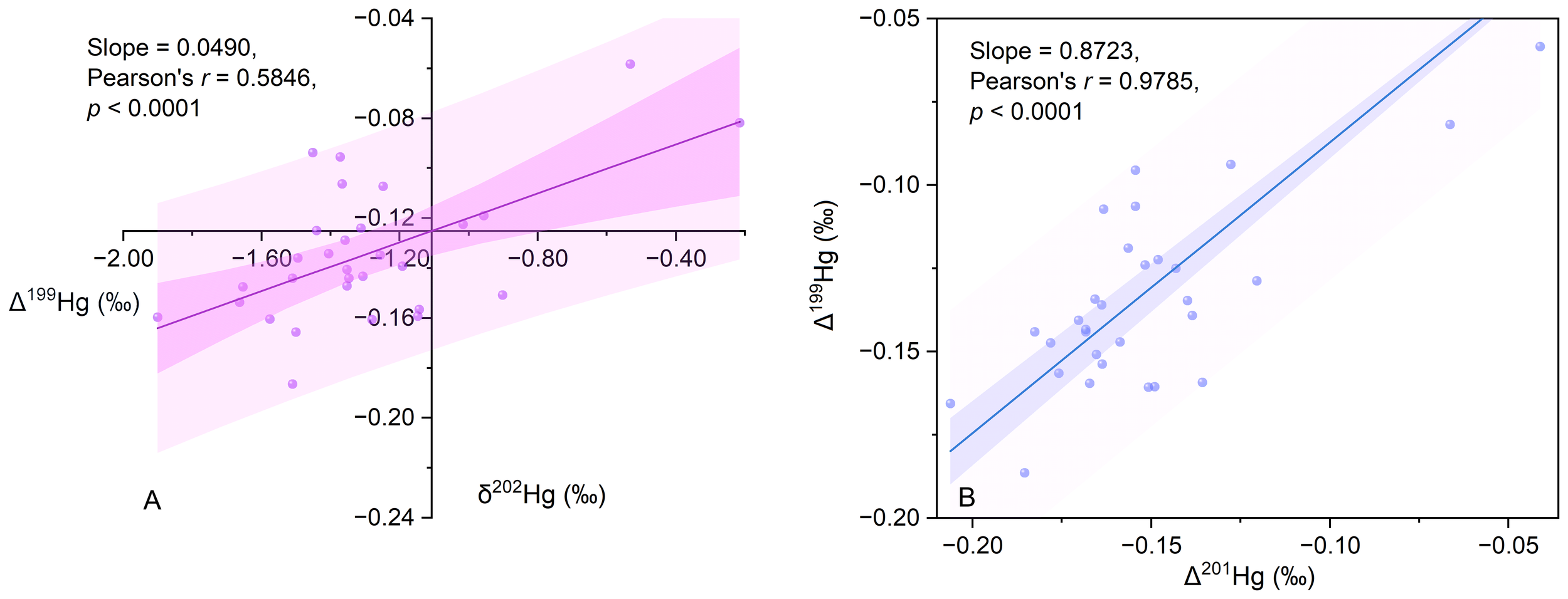 Pearson’s correlation analysis (Supplementary Table S1) showed that δ202Hg was significantly correlated with THg (r = 0.532), Δ199Hg (r = 0.585), and Δ201Hg (r = 0.704), Δ199Hg was significantly correlated with THg (r = 0.386) and Δ201Hg (r = 0.741), and Δ201Hg was also significantly correlated with THg (r = 0.672).