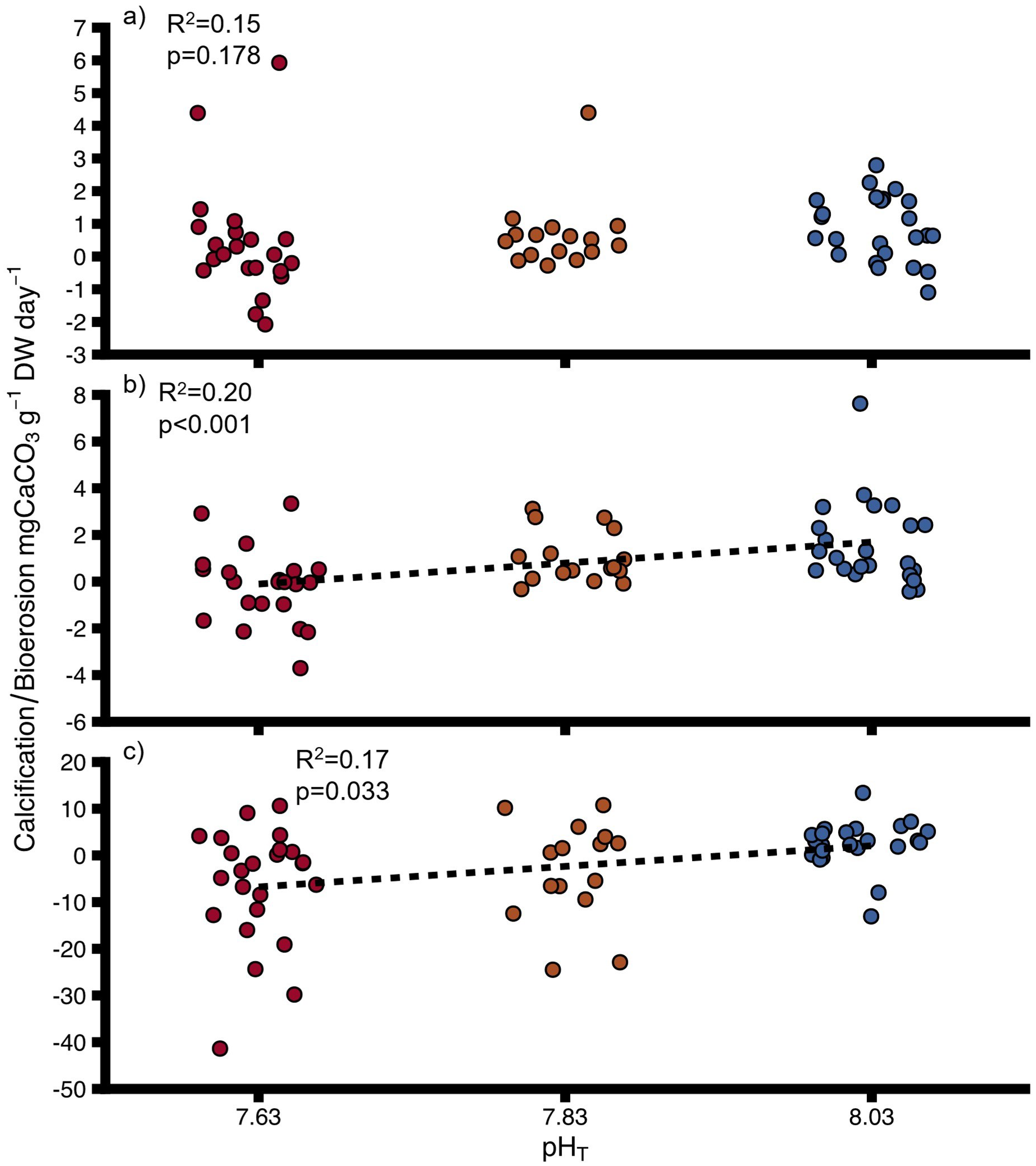 Net calcification (positive values)/net bioerosion rates (negative values) for (A) uninfested oysters, (B) infested oysters, (C) sponges at different pH. DW, dry weight for oysters and ash-free dry weight for sponges. Negative values indicate bioerosion activity, positive values indicate calcification activity. Points show individual values. Colours indicate pH treatment (blue = 8.03, orange = 7.83, red = 7.63). Dashed lines indicate significant trends. Proportions of variation (R2) and p-values were obtained from full linear mixed effect models.