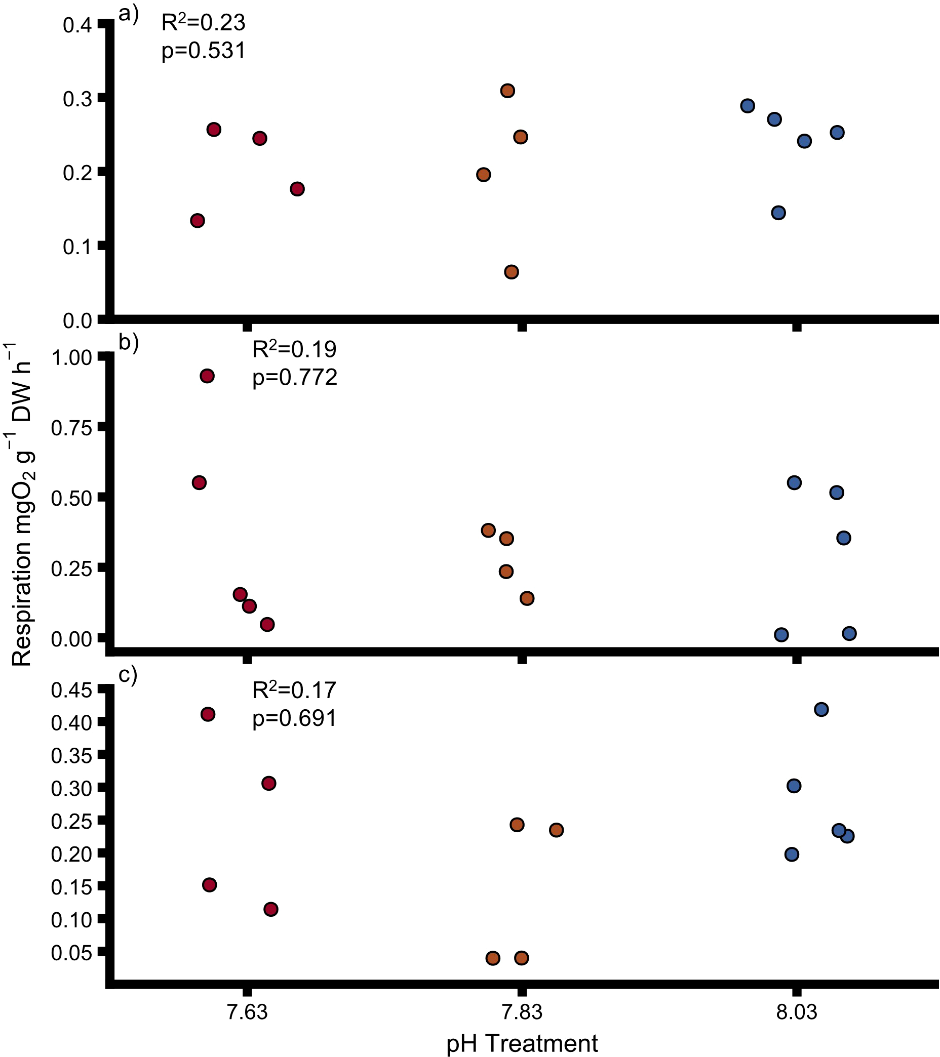 Respiration rates for (A) uninfested oysters, (B) infested oysters, (C) sponges at different pH. Points show individual values. Colours indicate pH treatment (blue = 8.03, orange = 7.83, red = 7.63). DW, dry weight for oysters and ash-free dry weight for sponges. Dashed lines indicate significant trends. Proportions of variation (R2) and p-values were obtained from full linear mixed effect models.
