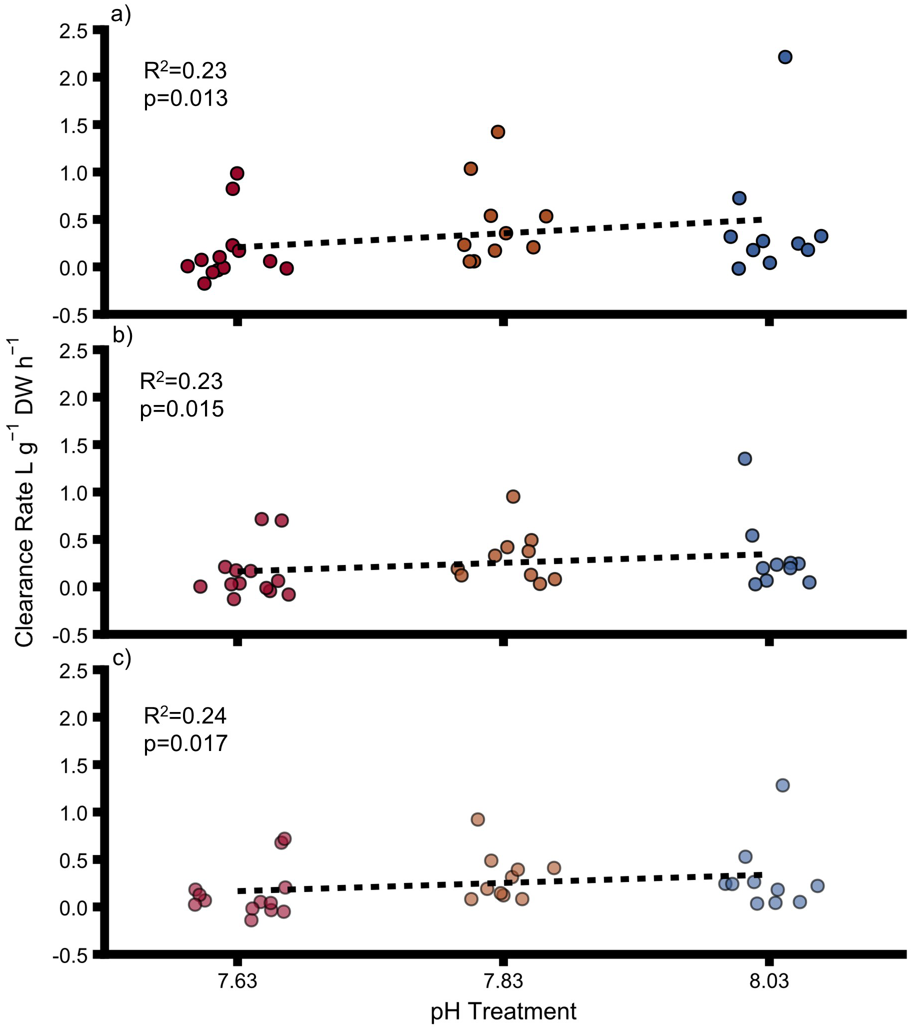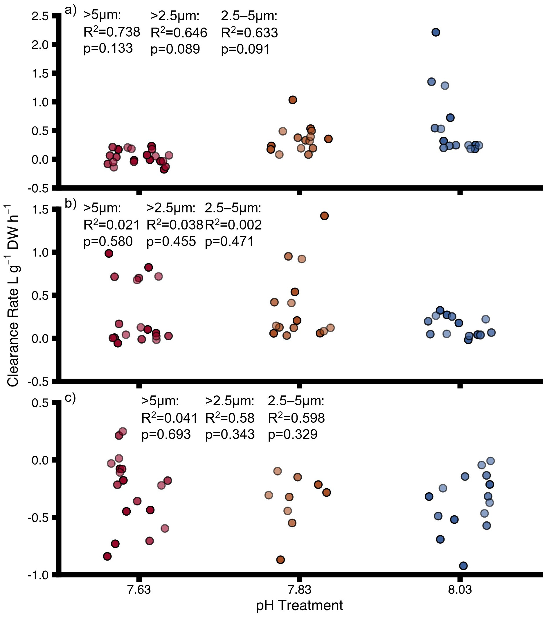 Clearance rates for (A) uninfested oysters, (B) infested oysters, (C) sponges at different pH for different particle size ranges. DW, dry weight for oysters and ash-free dry weight for sponges. Points show individual values. Colours indicate pH treatment (blue = 8.03, orange = 7.83, red = 7.63). The transparency of the colours reflects the particle size range: dark colours = >5–60 μm, medium colours = >2.5–60 μm, light colours = 2.5–5 μm. Proportions of variation (R2) and p-values were obtained from full linear mixed effect models.