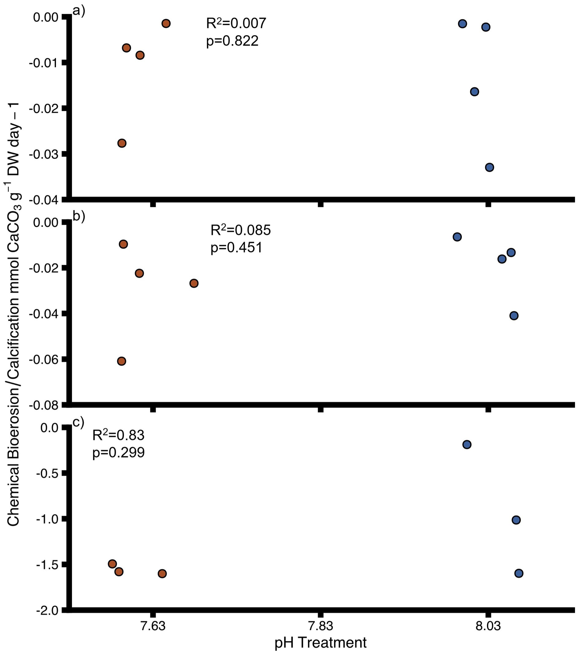 Chemical bioerosion (negative values) and calcification (positive values) for (A) uninfested oysters, (B) infested oysters and (C) sponges at different pH. DW = dry weight for oysters and ash-free dry weight for sponges Points show individual values. Colours indicate pH treatment (blue = 8.03, red = 7.63). Proportions of variation (R2) and p-values were obtained from full linear mixed effect model.
