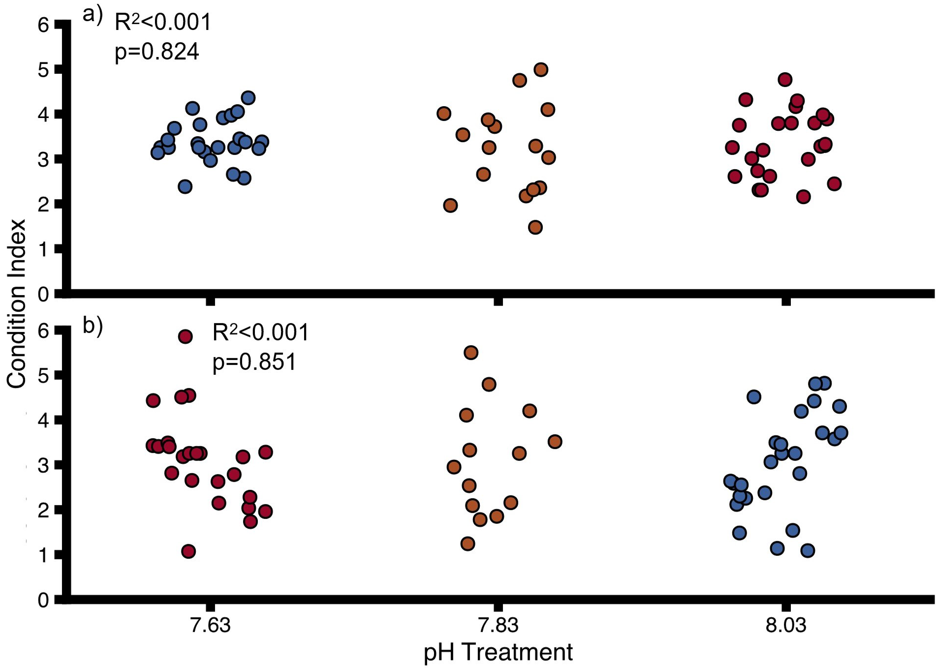 Condition Index for (A) uninfested oysters, (B) infested oysters at different pH. Points show individual values. Colours indicate pH treatment (blue = 8.03, orange = 7.83, red = 7.63). Proportions of variation (R2) and p-values were obtained from full linear mixed effect models.
