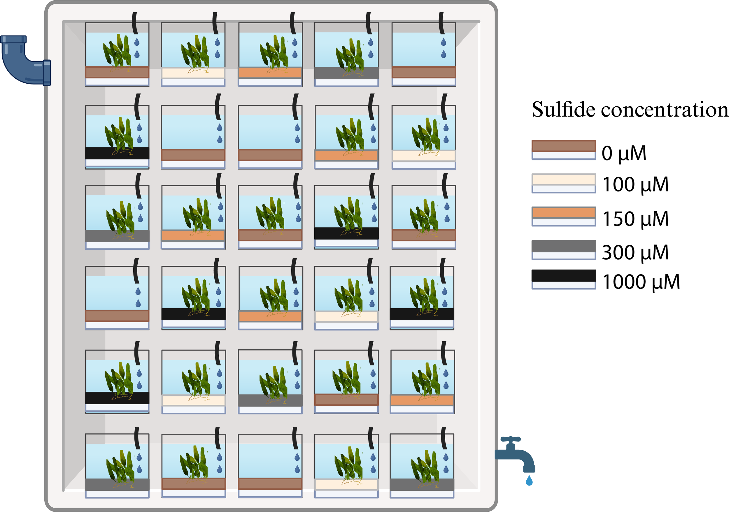 Mesocosm experiment set up: mesocosms with four sulphide concentrations of the agar plug (white) and the control (0 µM), with sediments and Caulerpa on top of the sulphide-containing agar; in addition, five control mesocosms with sediment but without Caulerpa were added to the experiment. All mesocosms were placed randomly in a flow-through system, with five replicates per treatment. Created with BioRender.com.