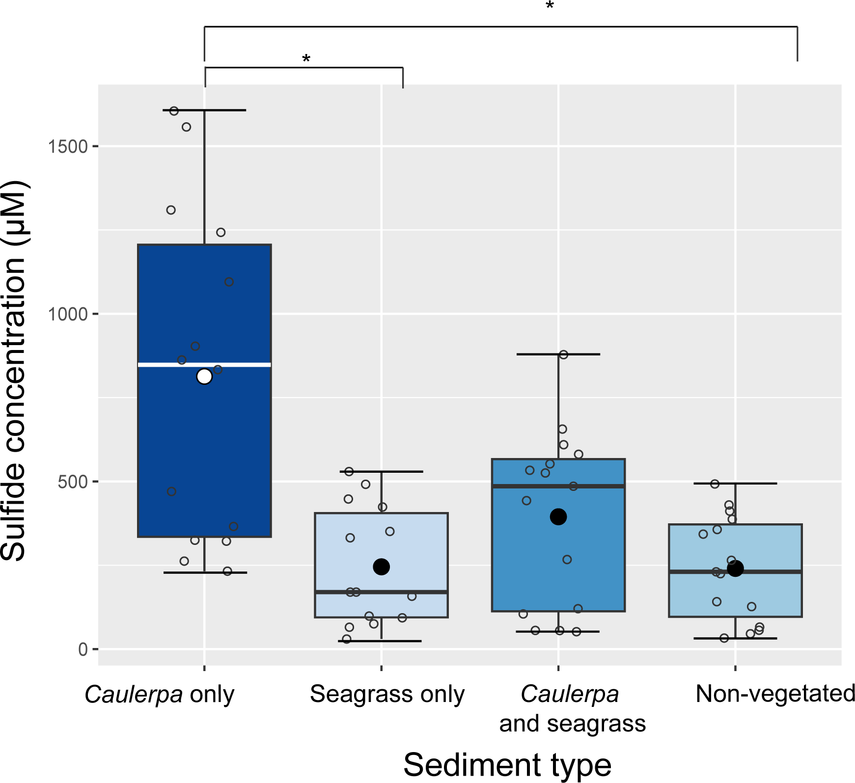 To determine the sulphide concentration in the natural sediments, we sampled the pore water from four types of sediments in the Ria Formosa (Faro, Portugal): (i) bare sediments, (ii) sediments with Caulerpa prolifera, (iii) sediments with the seagrass Cymodocea nodosa, and (iv) sediments with a mixture of C. prolifera and C. nodosa. We sampled three locations for each sediment type and took four or five samples from each location, i.e., 14-15 samples per sediment type (Supplementary Table S1). The water samples were directly mixed with a 10% (w/v) zinc acetate solution to fix the sulphide. Subsequently, the sulphide concentration was measured using the methylene blue method (Trüper and Schlegel, 1964), and the significance of the results was analysed using nested ANOVA.