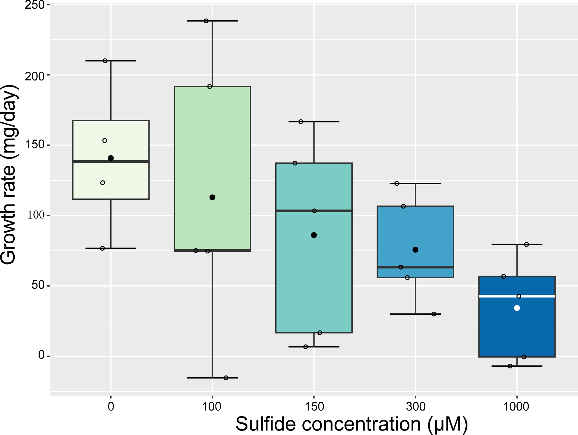 A significant linear decrease in Caulerpa weight-based growth rate with increased sulphide concentrations (ANOVA, F1 = 7.82, p = 0.01). The mean is indicated with a dot; open circles represent samples; error bars represent standard deviation; the line represents the median; and the boxplot borders represent the 25th and 75th percentile.