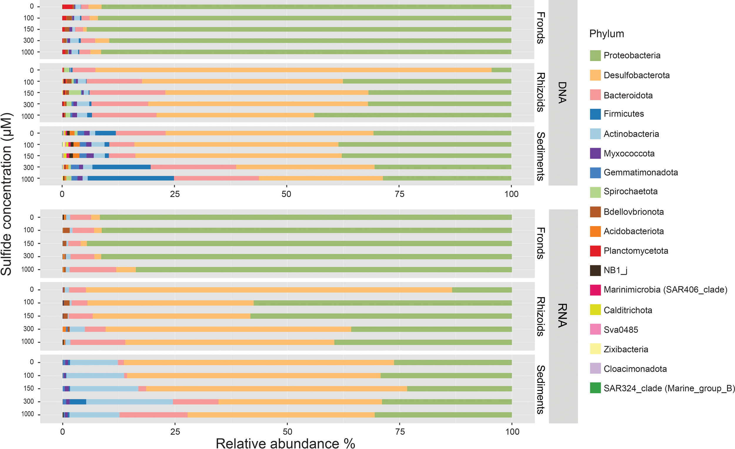 While the sulphide treatment did not affect the Shannon diversity (richness and evenness) index, it was significantly higher in the rhizoids and sediments compared to the fronds and in sediments compared to the rhizoids (Supplementary Figure S3). In the rhizoids and sediments, it was also higher for the DNA samples than for the RNA samples (Supplementary Figure S4).