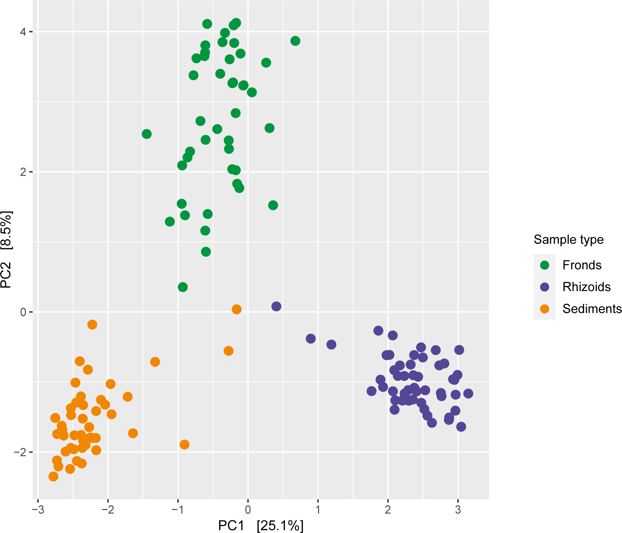 3.2.1 Compositional and indicator taxa in the fronds, rhizoids, and sediments