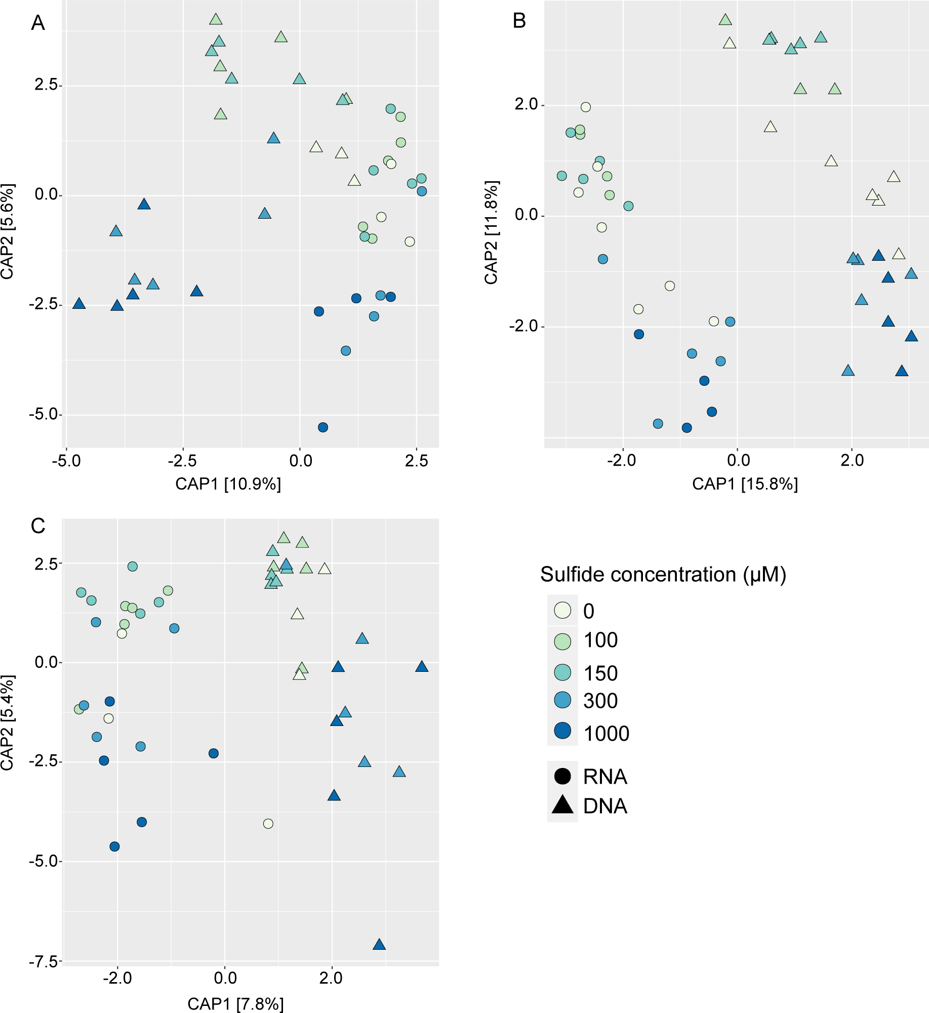Constrained analysis of principal coordinates of bacteria associated with Caulerpa prolifera rhizoids (A), fronds (B) and sediments (C) at different experimental sulphide concentrations. The ordinations are based on an Euclidian distance matrix. Triangles and circles represent DNA and RNA samples, respectively.