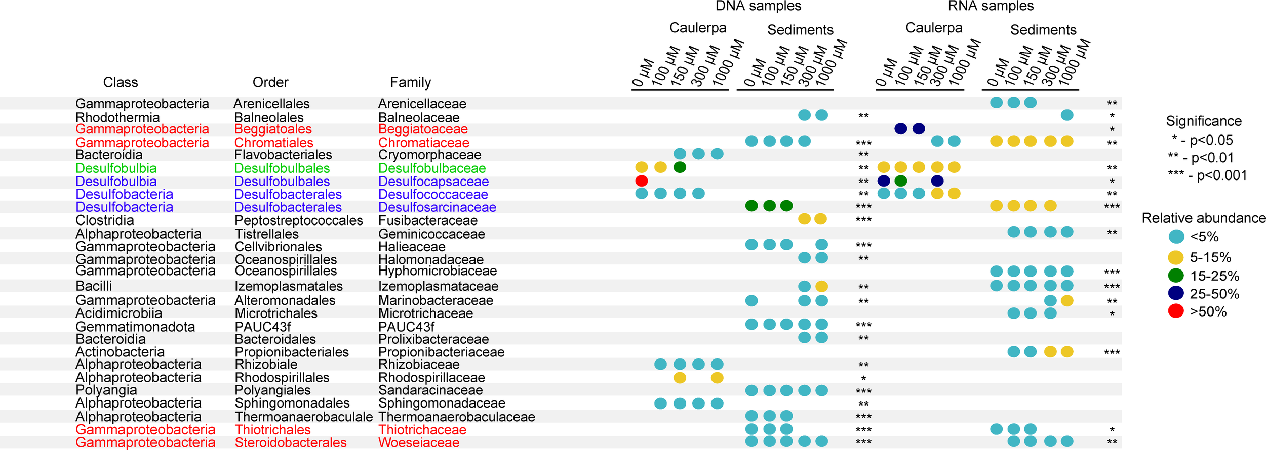 Indicator species analysis identified the sulphate reducer families Desulfocapsaceae and Desulfobulbaceae as indicator taxa for the Caulerpa rhizoids across all sulphide concentrations in DNA and RNA samples (Figure 7; Supplementary Table S6). In contrast, sulphide oxidising Beggiatoaceae was predominantly present in the RNA samples of the 100 µM and 150 µM sulphide treatments. The relative abundance of the Beggiatoaceae in the RNA samples was up to a maximum of 49% for the 100 µM sulphide treatment, whereas the maximum in the DNA samples was less than 1% (Supplementary Tables S4, S5). The sulphate reducer family Desulfosarcinaceae was an indicator taxon in the DNA and RNA samples of the sediment for all sulphide treatments except the highest concentration of 1000 µM. In addition, the sulphide oxidising families Woeseiaceae and Thiotrichacea were indicator taxa in the sediments but not in the rhizoids (Figure 7). For the fronds, abundant families like Rhodobacteraceae and Hyphomonadaceae were indicator taxa for all experimental treatments, suggesting no effect of sulphide on the fronds-associated microbial communities (Supplementary Table S6).