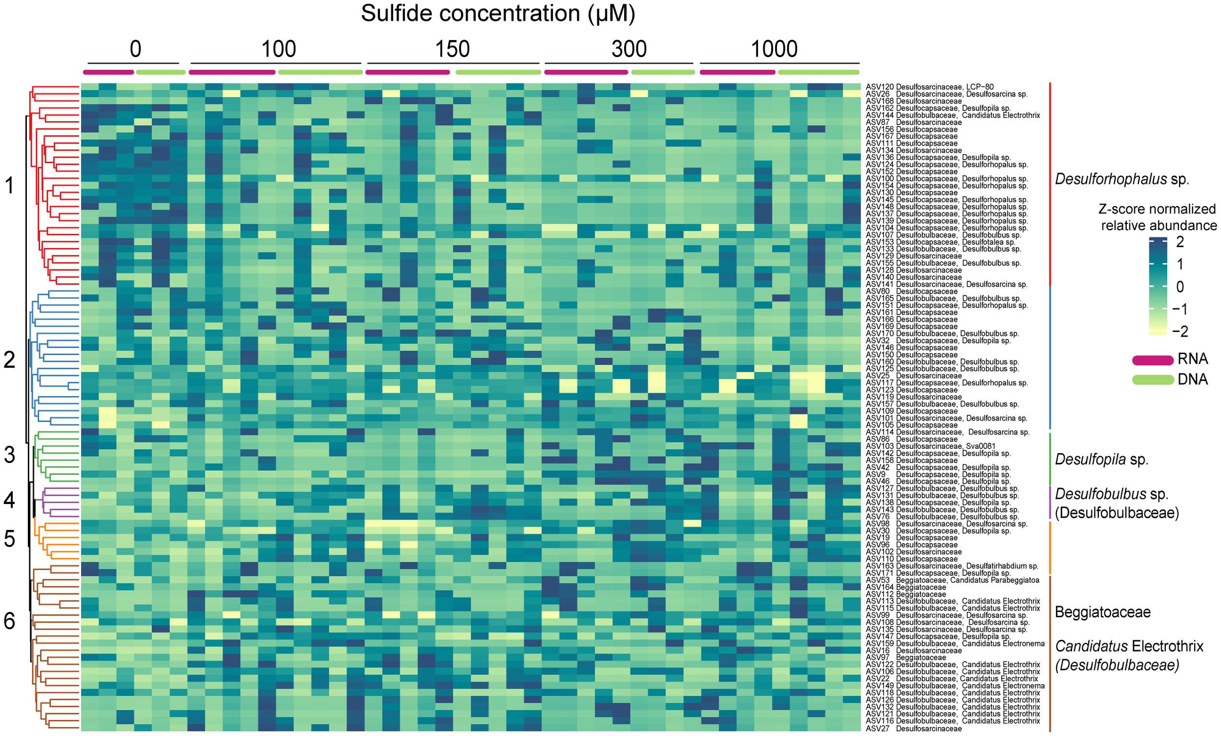 The enrichment analysis identified six significant clusters (Figure 8). The relative abundance of the indicator taxa followed roughly the same pattern in the DNA and RNA samples, although it was much more pronounced in the former. Two members of the family Desulfocapsaceae were enriched in two clusters; Desulforhophalus sp., in cluster one, was abundant in the 0 µM control but only present at low relative abundance in the sulphide treatments. In contrast, Desulfopila in cluster three was abundant at the highest sulphide concentrations but low in the 0, 100, and 150 µM sulphide treatments (Figure 8). Five ASVs affiliated with the Desulfobulbaceae family (cluster four) were mainly abundant at the two highest sulphide concentrations. Ca. Electrothrix in cluster six did not follow a clear pattern but seemed most abundant in the 100 µM and 150 µM sulphide treatments. Beggiatoaceae was enriched in cluster six; clusters two and five had no enriched species or families.