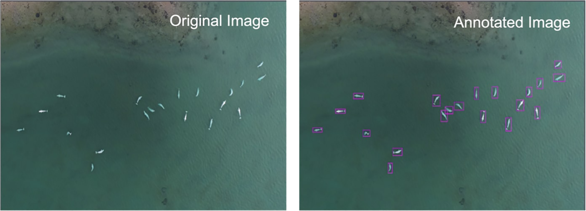 Data annotation is a crucial initial step in the development of deep learning pipelines. The data utilized for this study was extracted from the acquired drone footage videos, with frames extracted at a rate of one frame every three seconds. A total of 400 images were carefully chosen for annotation corresponding to the variety of scenes captured by the drone. The selection process aimed to accommodate various factors such as the drone’s altitude, the color and depth of seawater, and beluga whales’ closeness to the shore and to each other. The selection of distinctive scenes for annotation greatly contributes to the model’s ability to accurately localize beluga whales present under different conditions.