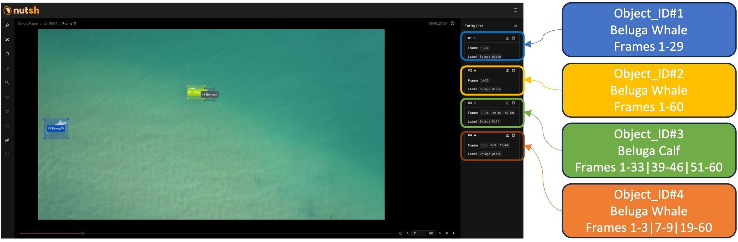 For the task of tracking beluga whales in the drone footage, a different approach was adopted utilizing nutsh.ai (Xu and Yu, 2023), an advanced tool specifically designed for video annotation for tracking tasks, as well as other vision tasks. This platform specializes in temporal data annotation, a key aspect for effectively tracking objects across video frames. In this phase, nutsh.ai was employed to annotate sequences rather than individual frames, enabling the identification and continuous tracking of individual beluga whales over time.