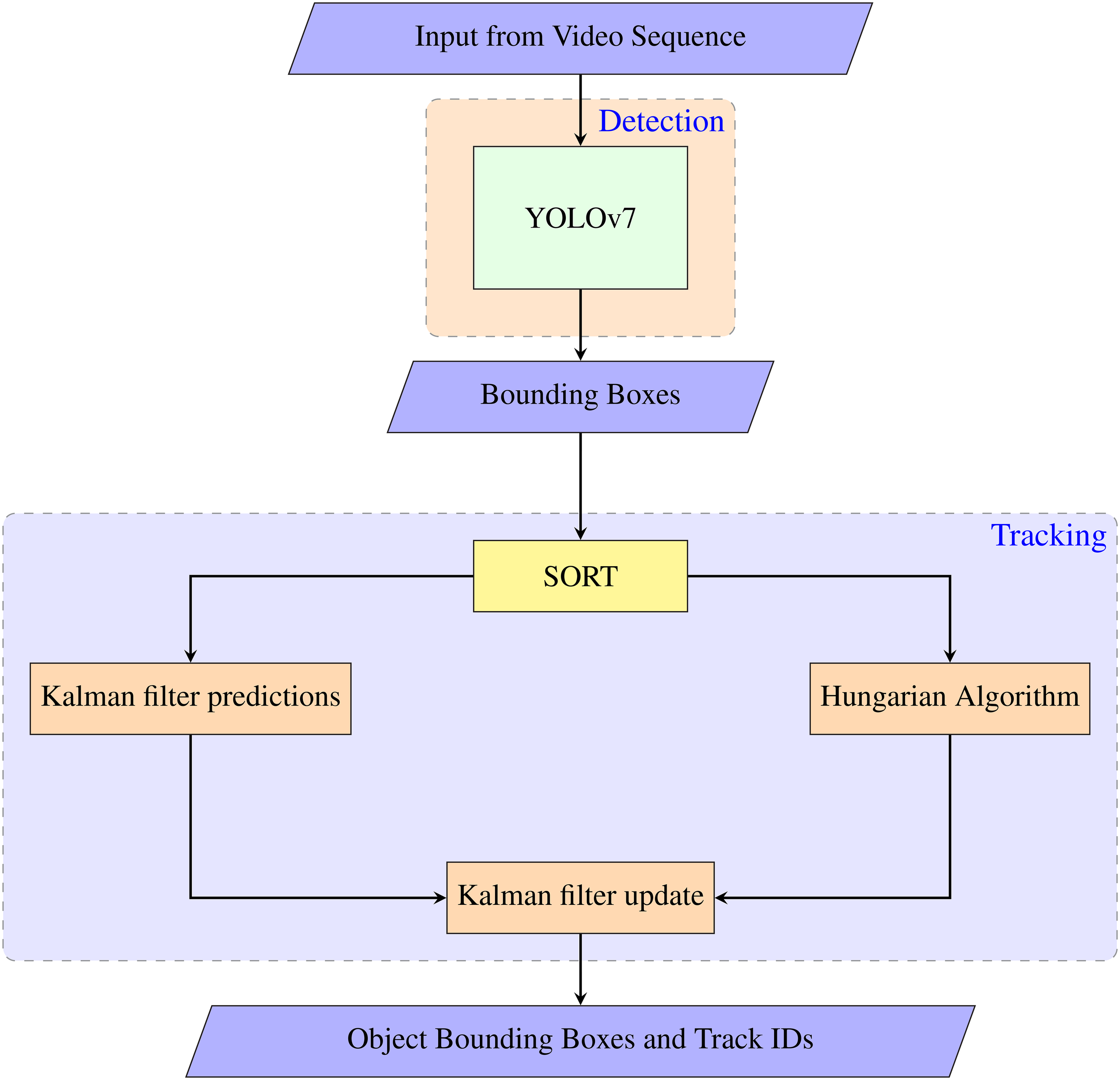 For tracking, we integrated the SORT algorithm (Bewley et al., 2016) with YOLO. The SORT algorithm is a popular tracking algorithm that extends our system’s abilities to track objects in real time with little overhead in computation. SORT operates on bounding boxes provided by the object detection model. It operates by assigning unique IDs to individual objects to track them over consecutive frames and estimates their positions and velocities using a Kalman filter (Kalman, 1960).