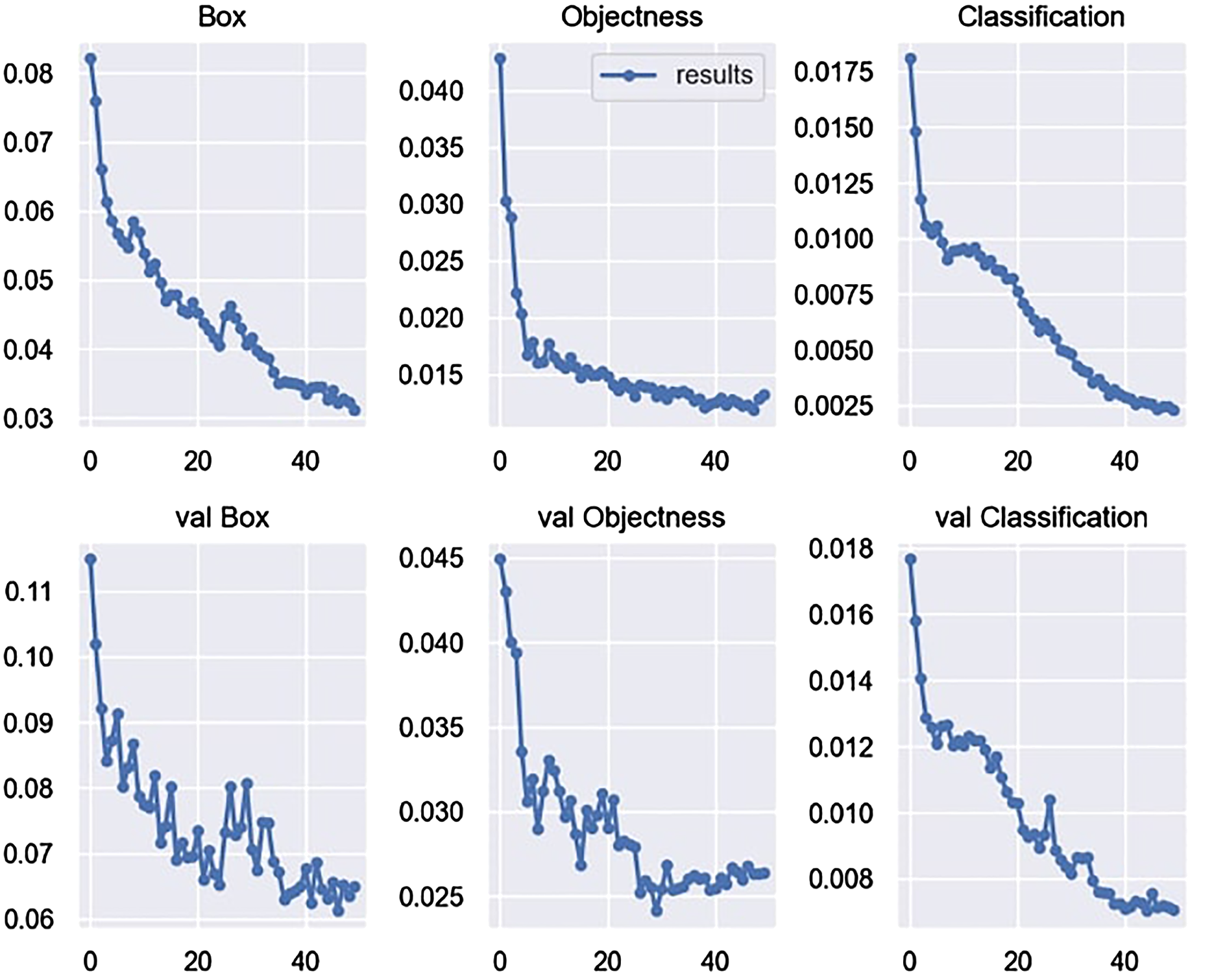The Objectness plot displays a consistent decrease in the loss associated with objectness score prediction throughout training, gradually declining from 0.05 to 0.012. Correspondingly, the validation plot, val Objectness, showcases a similar trend, lowering the loss from 0.045 to 0.025.