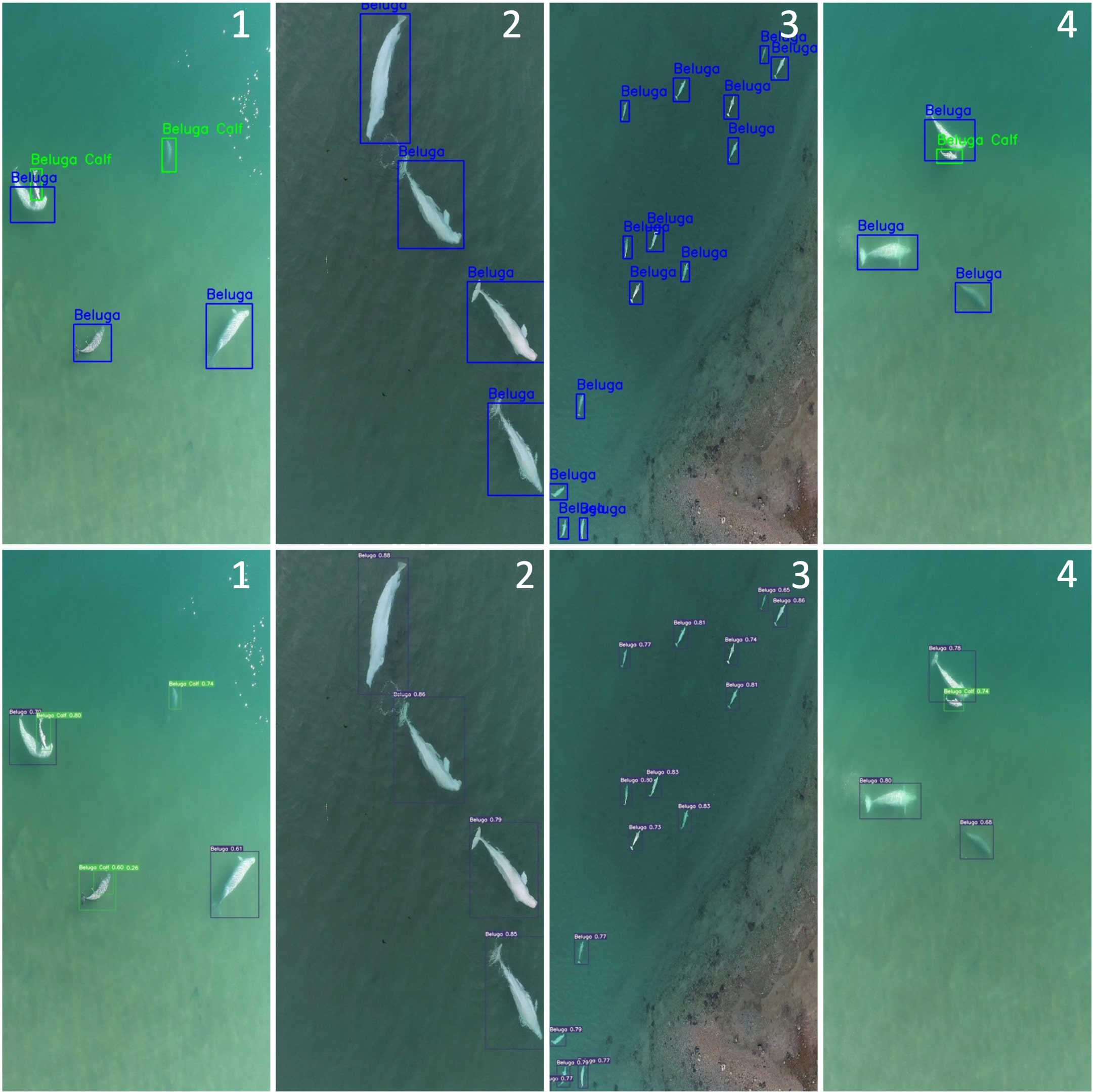The beluga whale detection testing involved comparing the results of the trained beluga whale detection model with the ground truth data. Ground truth data is the data the authors of this paper annotated using Roboflow. The test dataset comprised 60 images that were selected accordingly to represent the diverse scenes in which beluga adult whales appeared. Additionally, test images also include scenes with Beluga calves swimming close to adult beluga whales. Figure 6 shows only 4 unique images that encapsulate diverse scenes. The top row with images annotated 1-4 represents the ground truth images that were hand-labeled using the RoboFlow platform and the bottom row shows the same images as output from our trained detection model YOLOv7.
