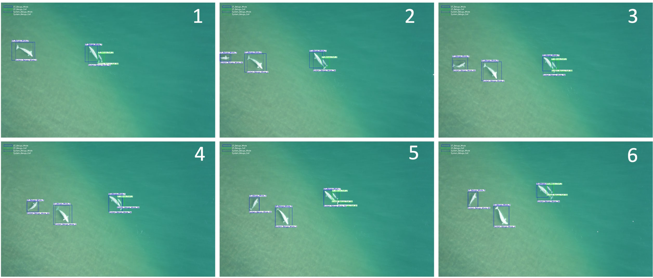 Figure 6 shows one miss-classification but almost no failed detection among the test dataset. In Figure 6, the first image shows a miss-classification of a beluga whale that was classified as a beluga calf. Overall our detection model produced near-perfect performance in localizing beluga adult whales and beluga calves. Note that some of the images included calves, including newborn neonate individuals.